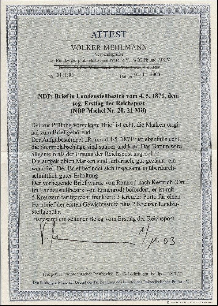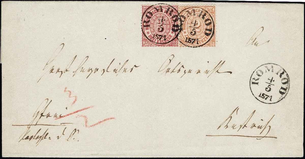 | Zusatzinformationen und Suchstichworte: | 376. Auktion Heinrich Köhler 19.-24. April 2021 Los 6001 ERSTTAG DER REICHSPOST vom 4.5.1871: 1869, Norddeutscher Postbezirk 2 und 3 Kreuzer gezähnt je mit glasklarem EKr. „ROMROD 4.5.1871“ als tarifgerechte Frankatur auf Faltbriefhülle nach Kestrich mit rückseitigem Ankunftsstempel „ERMENROD 5.5.“ in einwandfreier Erhaltung, seltener Brief aus dem Kreuzerbezirk mit vorausbezahlter 2 Kreuzer Landzustellgebühr, Fotoattest Mehlmann BPP (2003) Ausruf 1.150,00 EUR |