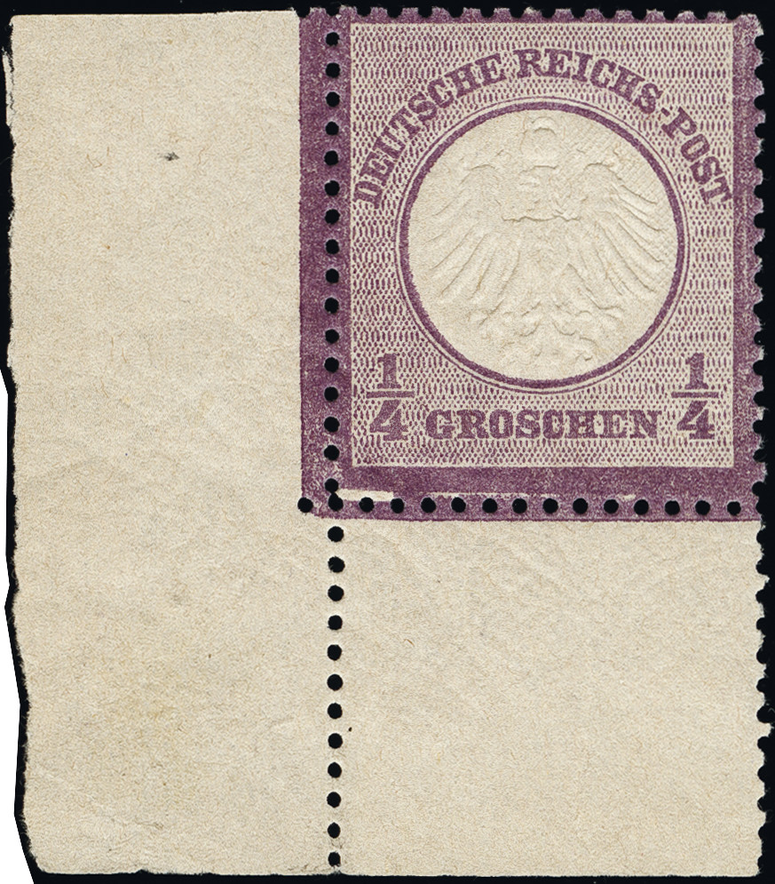| Zusatzinformationen und Suchstichworte: | 376. Auktion Heinrich Köhler 19.-24. April 2021 Los 6002 Kleiner Schild: 1872, ¼ Groschen lebhaftgrauviolett mit Plattenfehler „helle Striche im Rahmen unten links“ (Feld 141), aus der linken unteren Bogenecke mit breiten Rändern, postfrisch mit gummifreien Stellen in einwandfreier Erhaltung, sehr selten, bisher sind nur zwei postfrische Marken aus der Bogenecke mit diesem Plattenfehler registriert, unsigniert mit Fotoattest Sommer BPP (2004) Zuschlag 1.150,00 EUR |