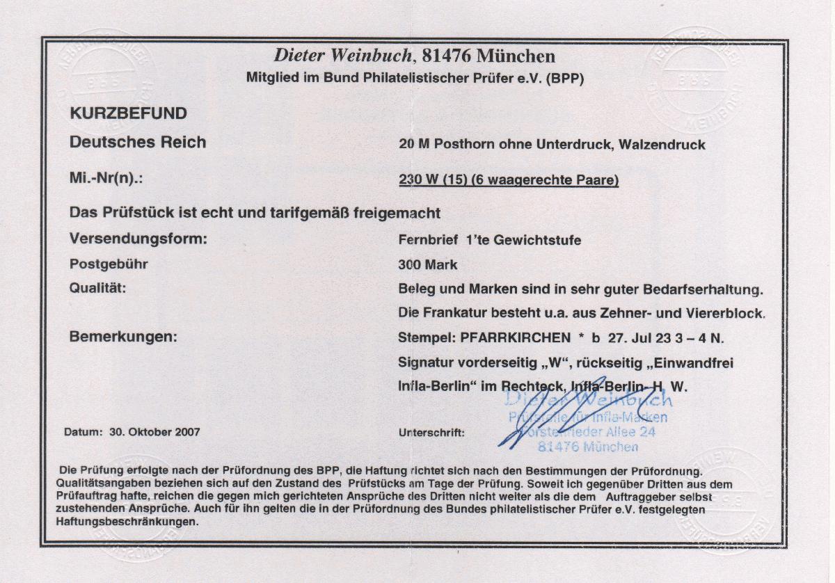| Zusatzinformationen und Suchstichworte: | Posthorn ohne Unterdruck, Walzendruck, "Einwandfrei Infla-Berlin" |