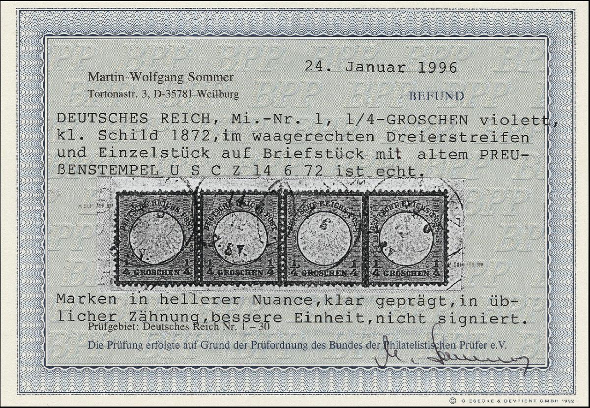 | Zusatzinformationen und Suchstichworte: | 376. Auktion Heinrich Köhler 19.-24. April 2021 Los 6005 ¼ Groschen violett, helle Nuance im waagerechten Dreierstreifen und Einzelstück mit EKr. „USCZ 14.6.72“ auf Briefstück, rechte Marke mit leichter Eckbugspur, sonst in guter Gesamterhaltung, Fotobefund Sommer BPP (1996) Ausruf 120,00 EUR |