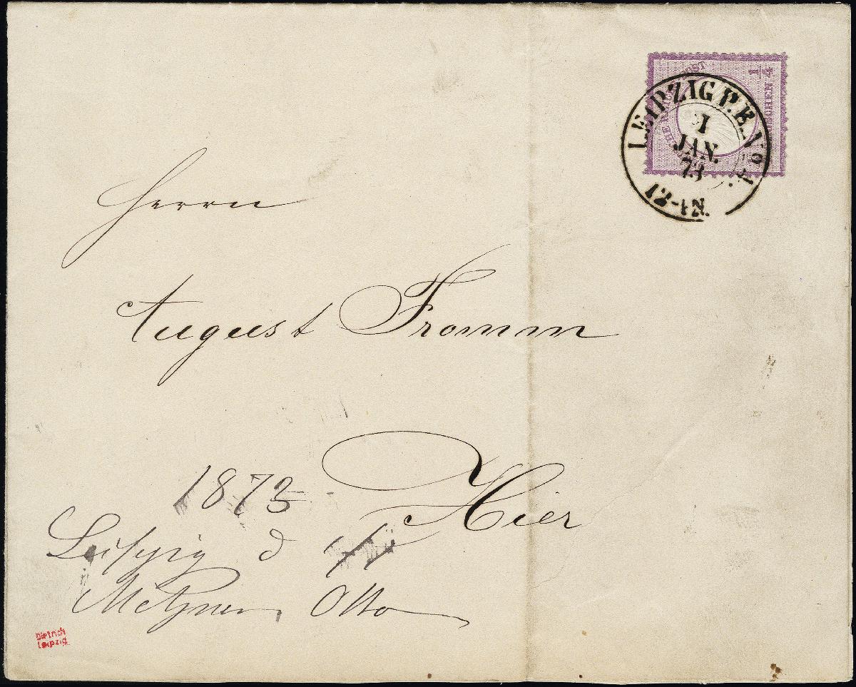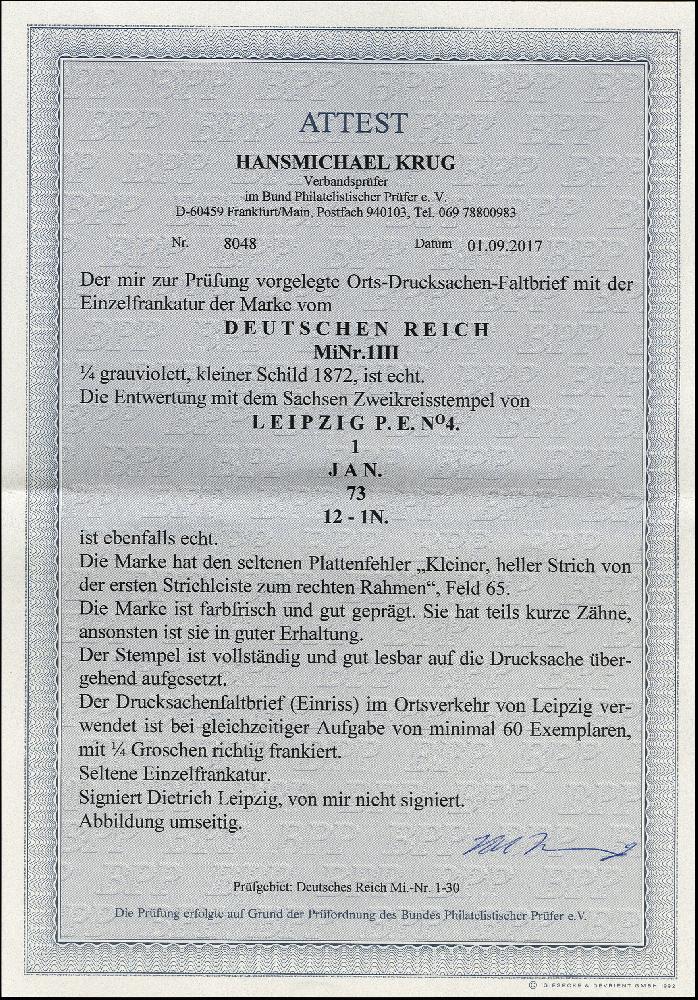 | Zusatzinformationen und Suchstichworte: | 376. Auktion Heinrich Köhler 19.-24. April 2021 Los 6009 ¼ Groschen grauviolett mit Plattenfehler „kleiner, heller Strich von der ersten Strichleiste zum rechten Rahmen (Feld 65) und DKr. „LEIPZIG No. 4 1.JAN.73“ als portogerechte Einzelfrankatur auf komplettem Drucksachenfaltbrief im Ortsverkehr mit Ankunftsstempel, Marke mit wenigen kurzen Zähnen und Drucksache mit senkrechter Faltung mit Einriss unten, sonst in guter Gesamterhaltung; auf Brief ein seltener Plattenfehler, signiert Dietrich Leipzig und Fotoattest Krug BPP (2017) Zuschlag 160,00 EUR |