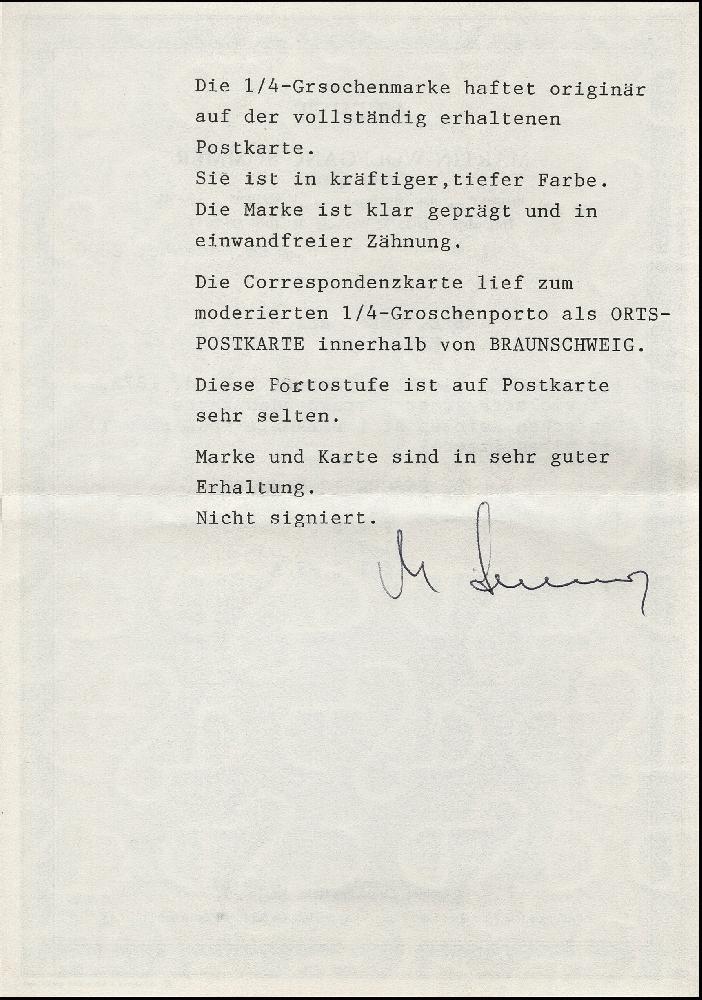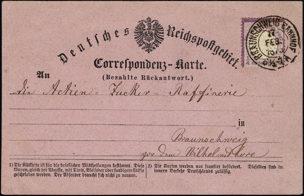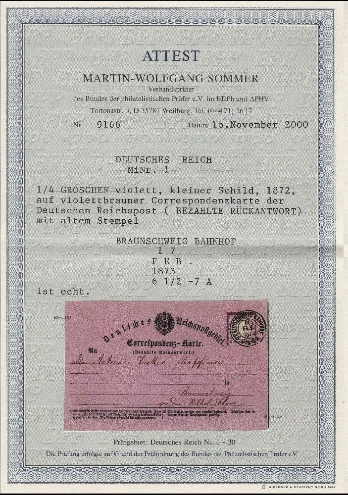 | Zusatzinformationen und Suchstichworte: | 376. Auktion Heinrich Köhler 19.-24. April 2021 Los 6007 ¼ Groschen violett mit DKr. „BRAUNSCHWEIG BAHNHOF 17.FEB.1873“ als portogerechte Einzelfrankatur auf violettbrauner Rückantwortkarte einer Correspondenz-Doppelkarte im Ortsverkehr gebraucht, dekorative Verwendung in einwandfreier Erhaltung, moderierte ¼ Groschen-Portostufen sind als Postkarte äußerst selten, Fotoattest Sommer BPP (2000) Zuschlag 560,00 EUR |