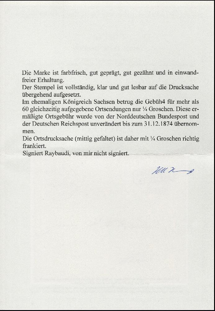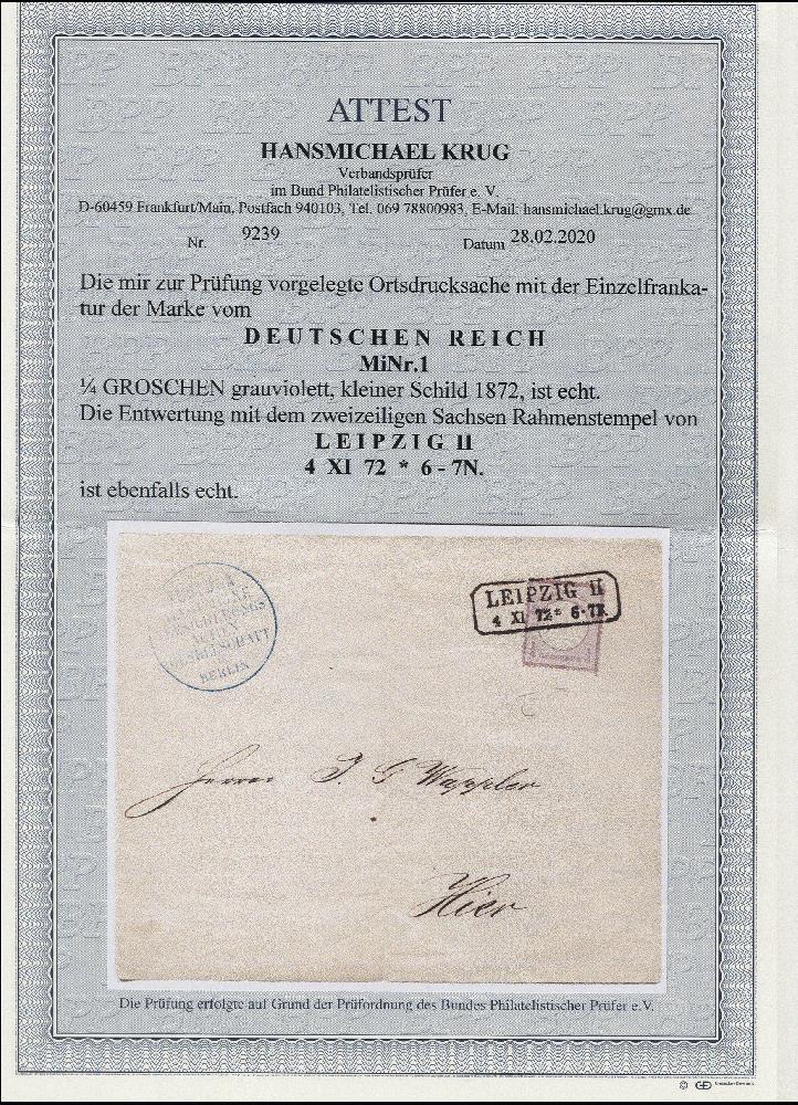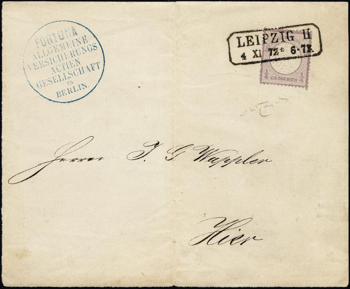 | Zusatzinformationen und Suchstichworte: | 376. Auktion Heinrich Köhler 19.-24. April 2021 Los 6008 ¼ Groschen grauviolett mit Ra2 „LEIPZIG II 4.XI.72“ als portogerechte Frankatur auf Drucksachenfaltbrief ohne Inhalt im Ortsverkehr mit Ausgabestempel, vorderseitig links mit dekorativem Absenderstempel der Fortuna-Versicherungsgesellschaft, Marke in einwandfreier Erhaltung, Drucksache mit Falt- und Beförderungsspuren, signiert Raybaudi und Fotoattest Sommer Krug BPP (2020) Zuschlag 160,00 EUR |