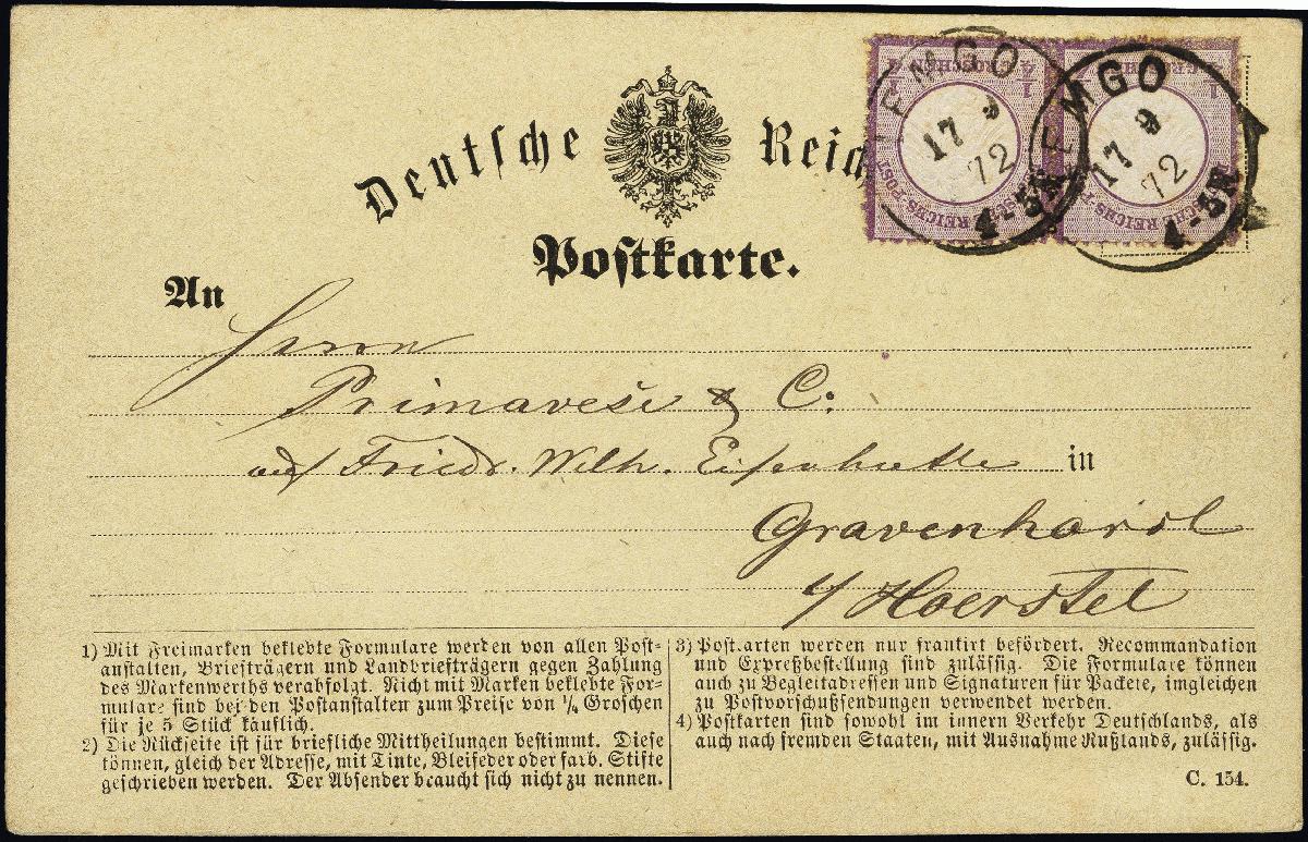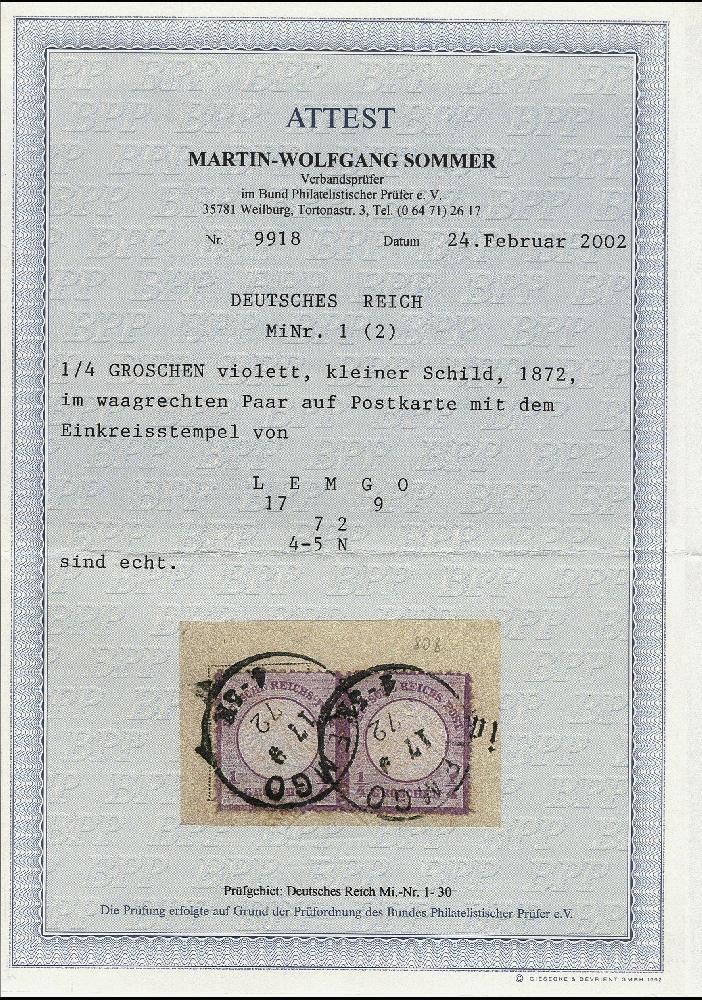| Zusatzinformationen und Suchstichworte: | 376. Auktion Heinrich Köhler 19.-24. April 2021 Los 6011 ¼ Groschen violett, tiefe Nuance der Flieder-Farbe, im senkrechten Paar mit EKr. „LEMGO 17.9.72“ als portogerechte Mehrfachfrankatur auf Postkarte nach Gravenhort, Marken mit vollständig rauher Zähnung und bis auf leichte Gelbpunkte in einwandfreier Erhaltung, Fotoattest Sommer BPP (2002) Zuschlag 100,00 EUR |