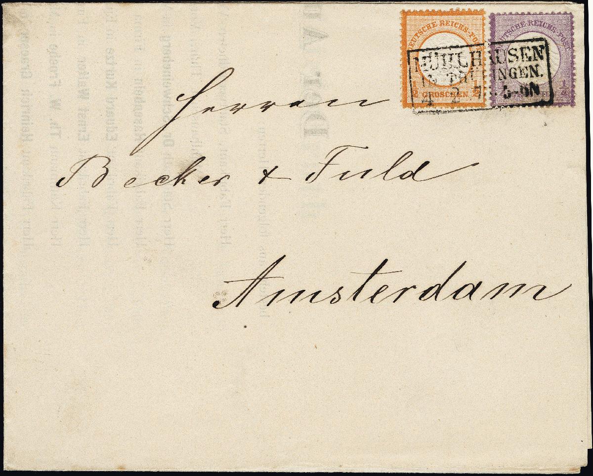 | Zusatzinformationen und Suchstichworte: | 376. Auktion Heinrich Köhler 19.-24. April 2021 Los 6020 ¼ Groschen violett im kleineren Format L15 in Mischfrankatur mit Großer Schild ½ Groschen orange mit Ra3 „MÜHLHAUSEN IN THÜRINGEN 4.2.73“ als portogerechte Frankatur auf komplettem Drucksachenfaltbrief nach Amsterdam in einwandfreier Erhaltung; nicht häufige Verwendung mit seltener Mischfrankatur, Fotoattest Sommer BPP (2003) Zuschlag 200,00 EUR |
