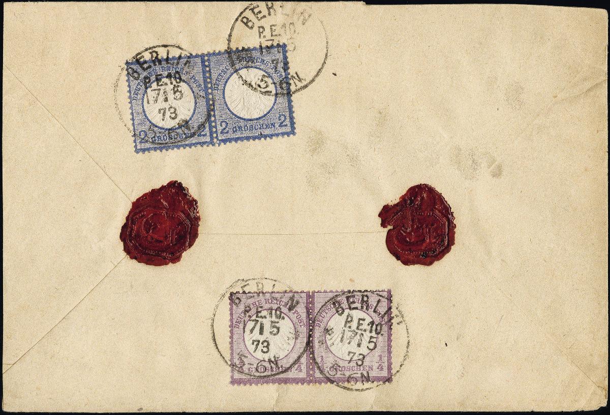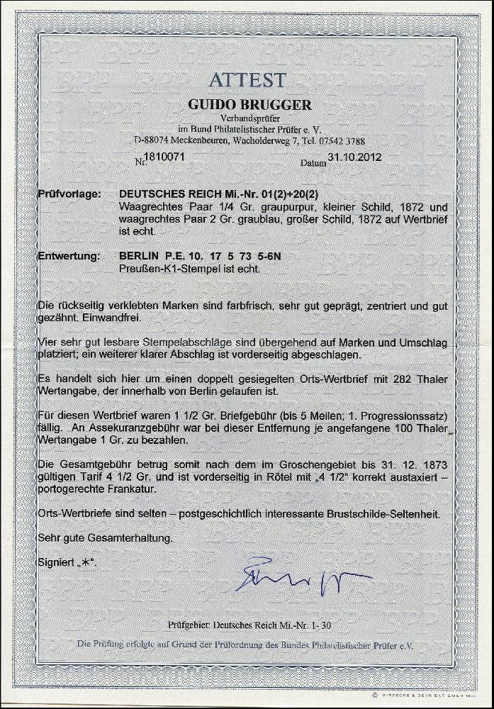 | Zusatzinformationen und Suchstichworte: | 376. Auktion Heinrich Köhler 19.-24. April 2021 Los 6022 ¼ Groschen graupurpur im waagerechten Paar in Mischfrankatur mit Großer Schild 2 Groschen graublau im waagerechten Paar, je mit klarem EKr. „BERLIN P.E.10. 17.5.73“ als portogerechte Frankatur rückseitig auf links leicht verkürztem Wertbrief im Ortsverkehr mit zwei kompletten Lacksiegeln in einwandfreier Erhaltung, dekorative und seltene Verwendung, Fotoattest Brugger BPP (2012) Zuschlag 950,00 EUR |