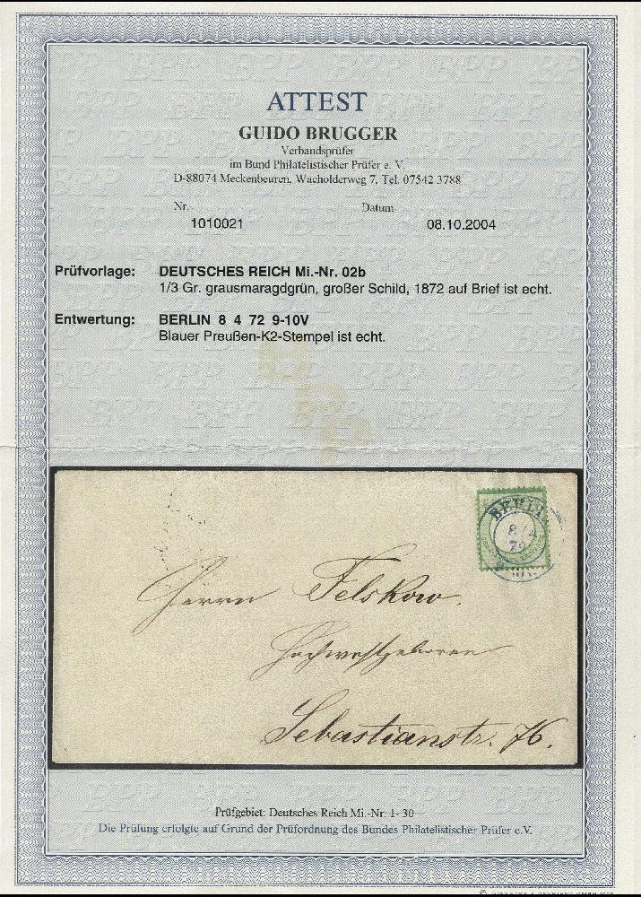 | Zusatzinformationen und Suchstichworte: | 376. Auktion Heinrich Köhler 19.-24. April 2021 Los 6026 1/3 Groschen grausmaragdgrün, helle Nuance mit blauem DKr. „BERLIN 8.4.72“ als portogerechte Einzelfrankatur auf Ortsbrief bei gleichzeitiger Aufgabe von mindestens 100 Briefen durch einen Absender mit rückseitigem Ankunftsstempel, gute Gesamterhaltung, nicht häufiges moderiertes Porto für Mengenauflieferungen, signiert Brugger BPP mit Fotoattest (2004) Zuschlag 220,00 EUR |