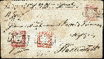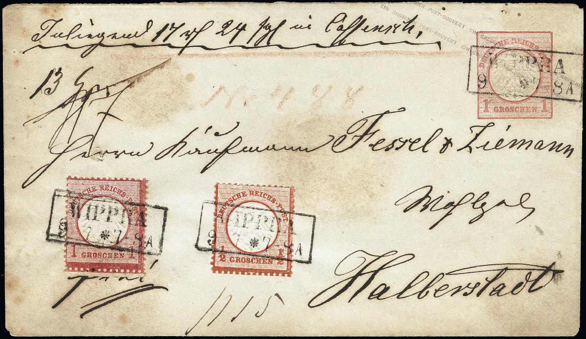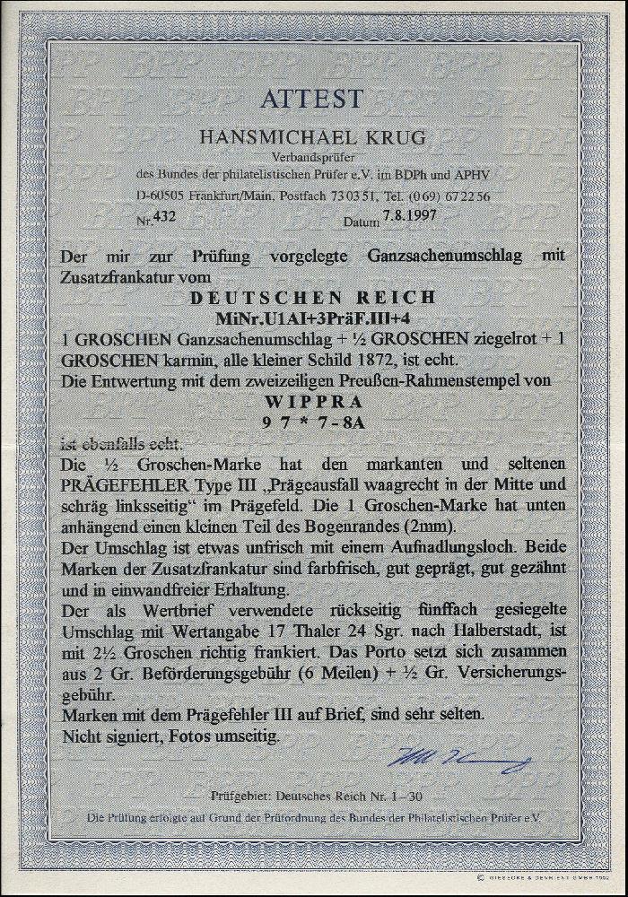 | Zusatzinformationen und Suchstichworte: | 376. Auktion Heinrich Köhler 19.-24. April 2021 Los 6032 ½ Groschen ziegelrot mit Prägefehler „Prägeausfall waagerecht in der Mitte und schräg linksseitig“ (Type III) und 1 Groschen karmin unten mit kleinem Teil des Bogenrandes je mit Ra2 „WIPPRA 9.7.“ als portogerechte Zufrankatur auf Ganzsachenumschlag 1 Groschen als Wertbrief nach Halberstadt mit Ausgabestempel, Umschlag etwas unfrisch mit einem Aufnadlungsloch, Marken in einwandfreier Erhaltung, auf Brief ist der Prägefehler in Type III sehr selten, Fotoattest Krug BPP (1997) Ausruf 300,00 EUR |