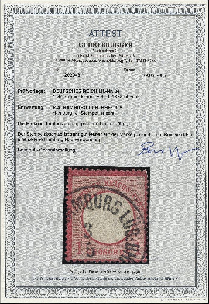 | Zusatzinformationen und Suchstichworte: | 376. Auktion Heinrich Köhler 19.-24. April 2021 Los 6037 1 Groschen karmin mit EKr. „(P.A.H)AMBURG LÜB.BHF. 3.5…“ in einwandfreier Erhaltung, seltener nachverwendeter Stempel von Hamburg, Fotoattest Brugger BPP (2006) Zuschlag 170,00 EUR |