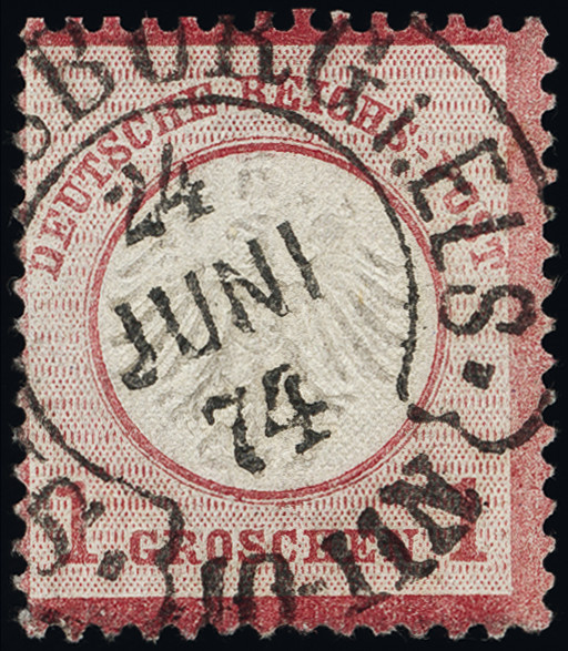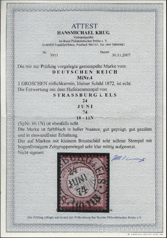 | Zusatzinformationen und Suchstichworte: | 376. Auktion Heinrich Köhler 19.-24. April 2021 Los 6038 1 Groschen karmin mit klarem Hufseisenstempel „STRASSBURG i. ELS. 24.JUNI.74“ mit bogenförmigem Zeitgruppenriegel (Spalink 36-1N) in einwandfreier Erhaltung, auf Marken mit kleinem Brustschild eine sehr seltene Entwertung, Fotoattest Krug BPP (2007) Zuschlag 260,00 EUR |