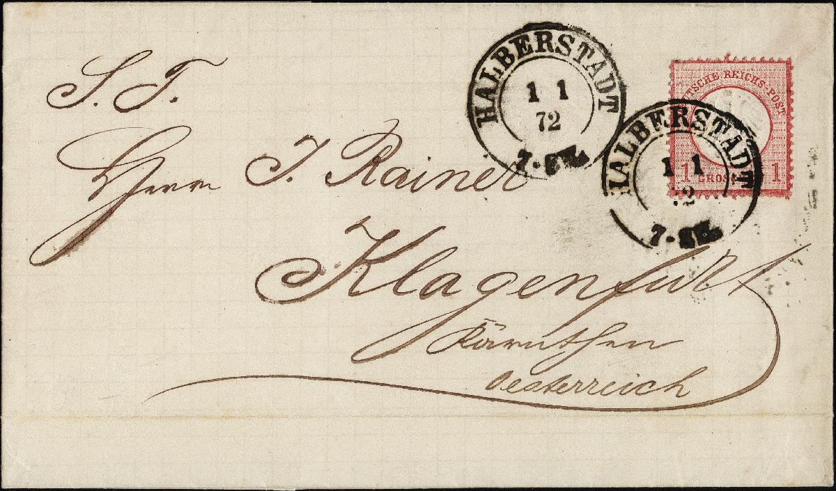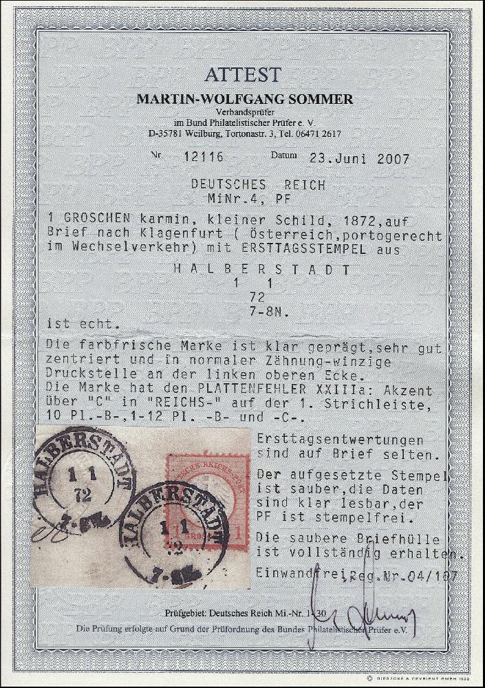 | Zusatzinformationen und Suchstichworte: | 376. Auktion Heinrich Köhler 19.-24. April 2021 Los 6049 1 Groschen karmin mit Plattenfehler „Akzent über C in REICHS“ (Feld 10) und DKr. „HALBERSTADT 1.1.72“ als portogerechte Einzelfrankatur auf Briefhülle im Wechselverkehr nach Klagenfurt, Österreich mit Ankunftsstempel, Marke mit leichter Druckstelle und Briefhülle mit Faltspuren, sonst in guter Gesamterhaltung, seltene Verwendung vom Ersttag, Fotoattest Sommer BPP (2007) Zuschlag 1.200,00 EUR |