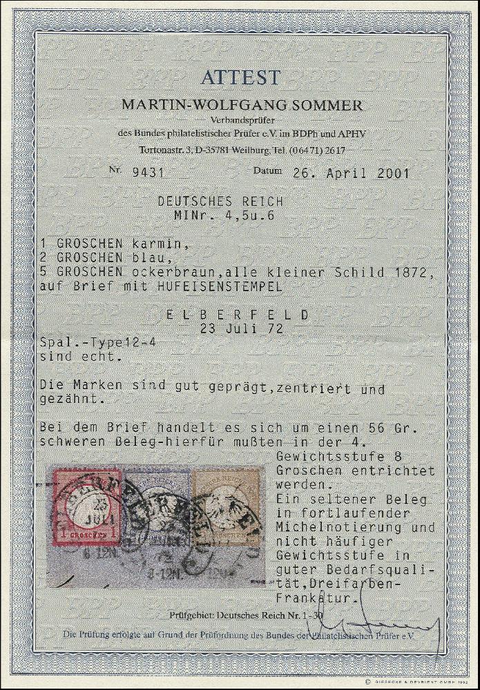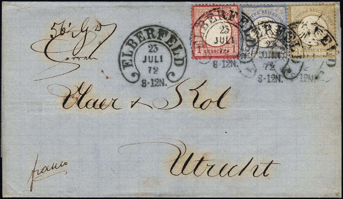 | Zusatzinformationen und Suchstichworte: | 376. Auktion Heinrich Köhler 19.-24. April 2021 Los 6050 1 Groschen karmin, 2 Groschen blau und 5 Groschen ockerbraun je mit Hufeisenstempel „ELBERFELD 23.JULI.72“ (Spalink 12-4) als portogerechte Frankatur auf Faltbriefhülle der 4. Gewichtsstufe nach Utrecht mit Ankunftsstempel, leichte Beförderungsspuren und Patina, sonst in guter Gesamterhaltung, nicht häufige Dreifarbenfrankatur ins Ausland, Fotoattest Sommer BPP (2001) Zuschlag 250,00 EUR |