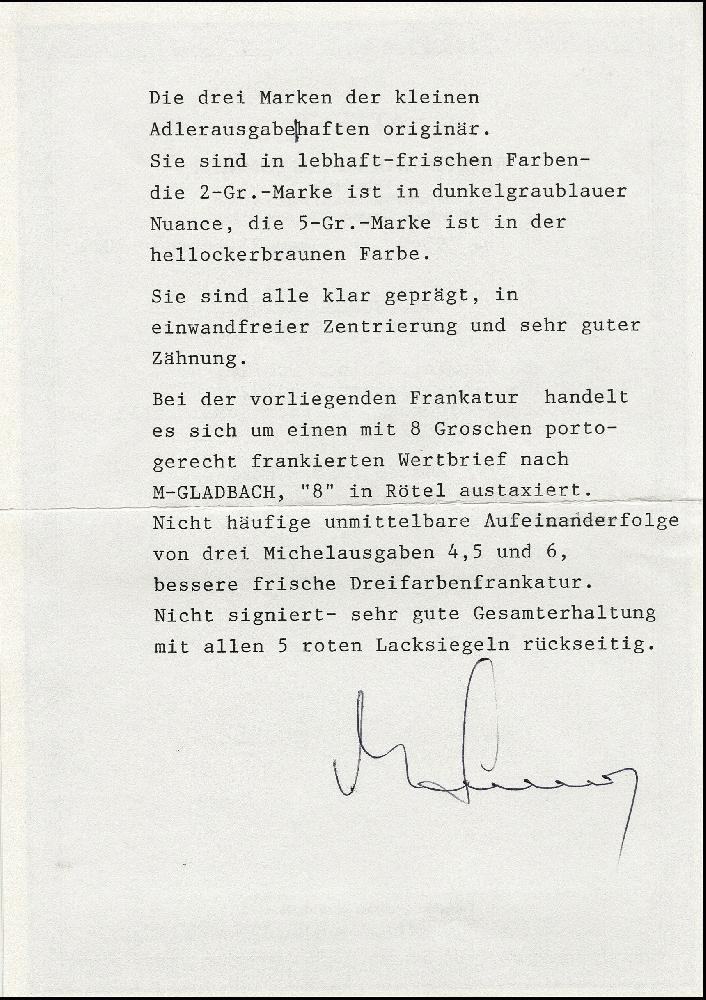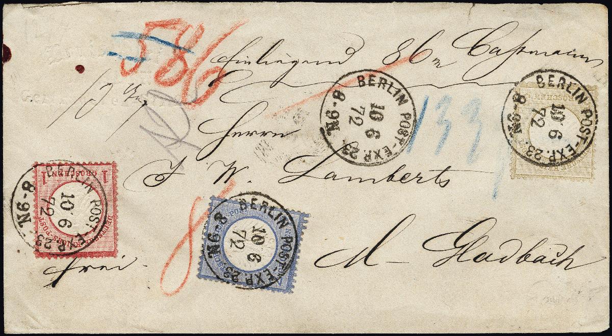 | Zusatzinformationen und Suchstichworte: | 376. Auktion Heinrich Köhler 19.-24. April 2021 Los 6051 1 Groschen karmin, 2 Groschen blau und 5 Groschen ockerbraun je mit EKr. „BERLIN POST-EXP. 23. 10.6.72“ als portogerechte Frankatur auf Paketbegleitbrief nach M.-Gladbach mit rückseitig kompetten Lacksiegeln und Ankunftsstempel, Umschlag mit kleinen Beförderungsspuren, Marken in einwandfreier Erhaltung, dekorative Dreifarbenfrankatur, Fotoattest Sommer BPP (2001) Zuschlag 320,00 EUR |
