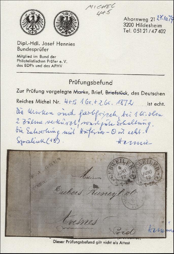 | Zusatzinformationen und Suchstichworte: | 376. Auktion Heinrich Köhler 19.-24. April 2021 Los 6058 2 Groschen grauultramarin mit Plattenfehler „beschädigter Bogen der linken Wertziffer“ (Feld 25) und 1 Groschen karmin je mit Hufeisenstempel „GEBWEILER 6.JUNI.72“ (Spalink 13) als portogerechte Frankatur auf Faltbrief nach Avesnes, Frankreich mit Ankunftsstempel, bis auf wenige kurze Zähne in guter Gesamterhaltung, Fotobefund Hennies BPP (1979) und Fotoattest Brugger BPP (2014) Zuschlag 150,00 EUR |