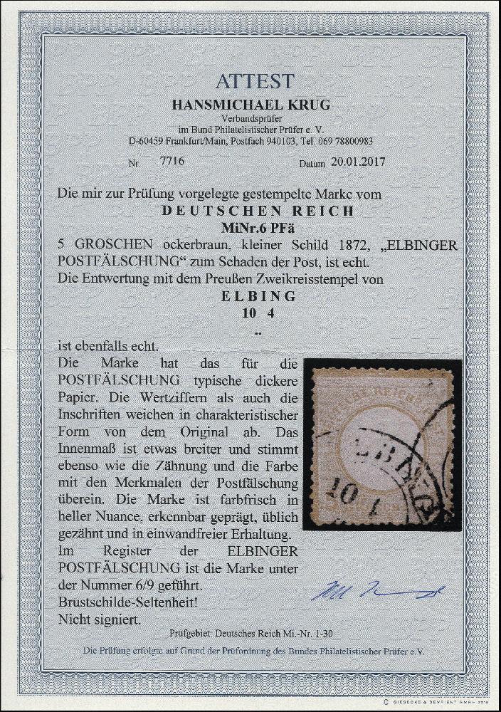 | Zusatzinformationen und Suchstichworte: | 376. Auktion Heinrich Köhler 19.-24. April 2021 Los 6064 ELBINGER POSTFÄLSCHUNG: 5 Groschen ockerbraun auf dickerem Papier und mit typischer Zähnung mit DKr. „ELBING 10.4.“, einwandfreie Erhaltung, sehr selten, bisher sind mit kleinem Schild nur neun Exemplare der Elbinger Postfälschung bekannt, Fotoattest Krug BPP (2017) Zuschlag 4.200,00 EUR |