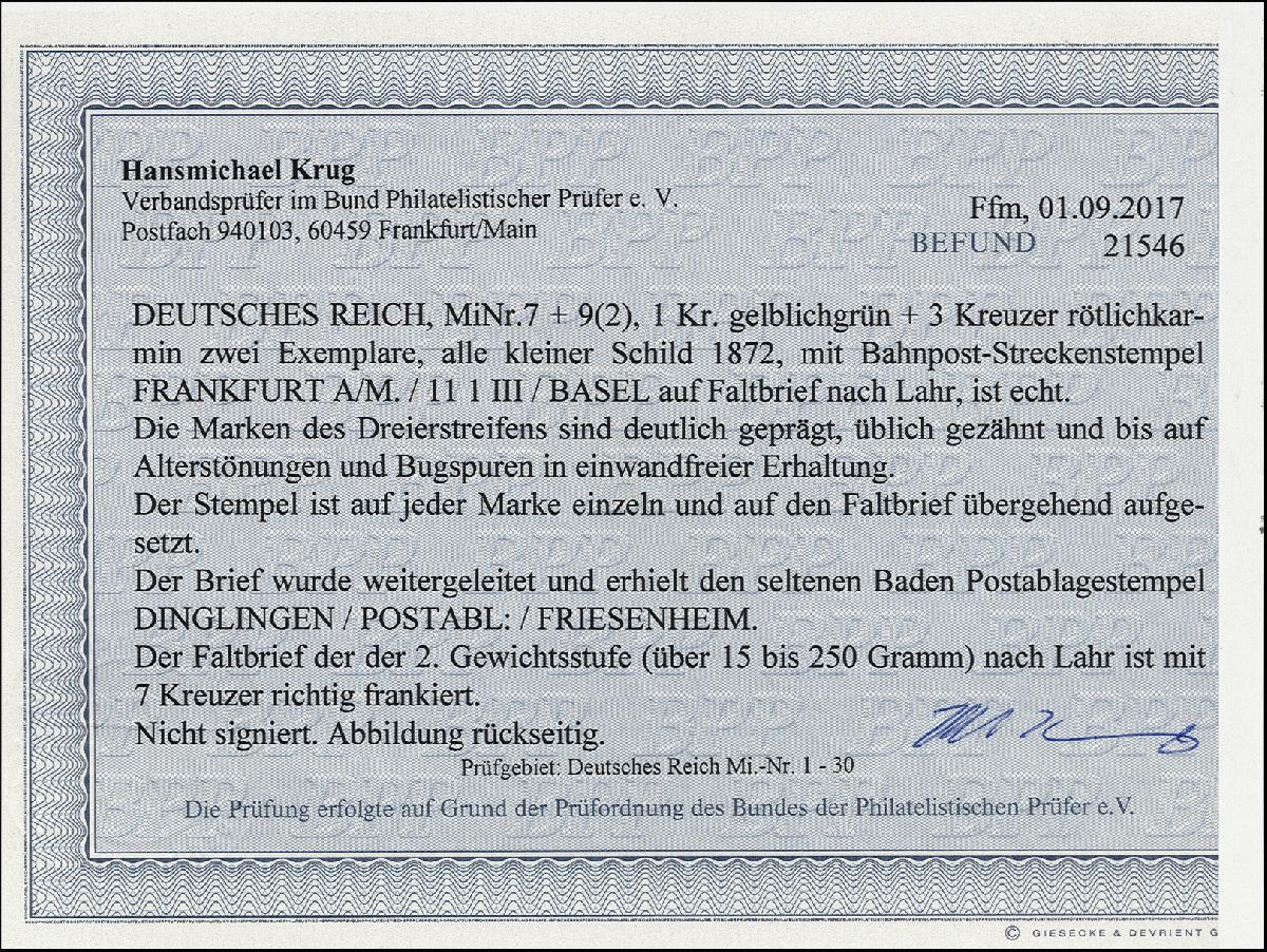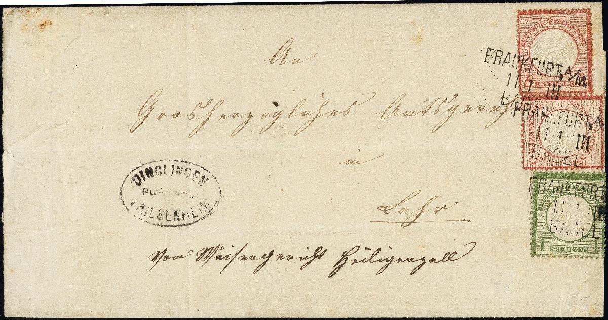 | Zusatzinformationen und Suchstichworte: | 376. Auktion Heinrich Köhler 19.-24. April 2021 Los 6072 1 Kreuzer gelblichgrün und zwei Einzelwerte 3 Kreuzer rötlichkarmin je mit Bahnpost-L3 „FRANKFURT A/M. 11 1 III BASEL“ als portogerechte Frankatur auf Faltbriefhülle mit nebengesetztem Postablagestempel „DINGLINGEN POSTABL: FRIESENHEIM“ nach Lahr mit Ankunftsstempel und vorderseitig mit handschriftlichen Weiterleitungsvermerk, Marken und Brief mit Faltspuren und etwas fleckig, Fotobefund Krug BPP (2017) Zuschlag 160,00 EUR |