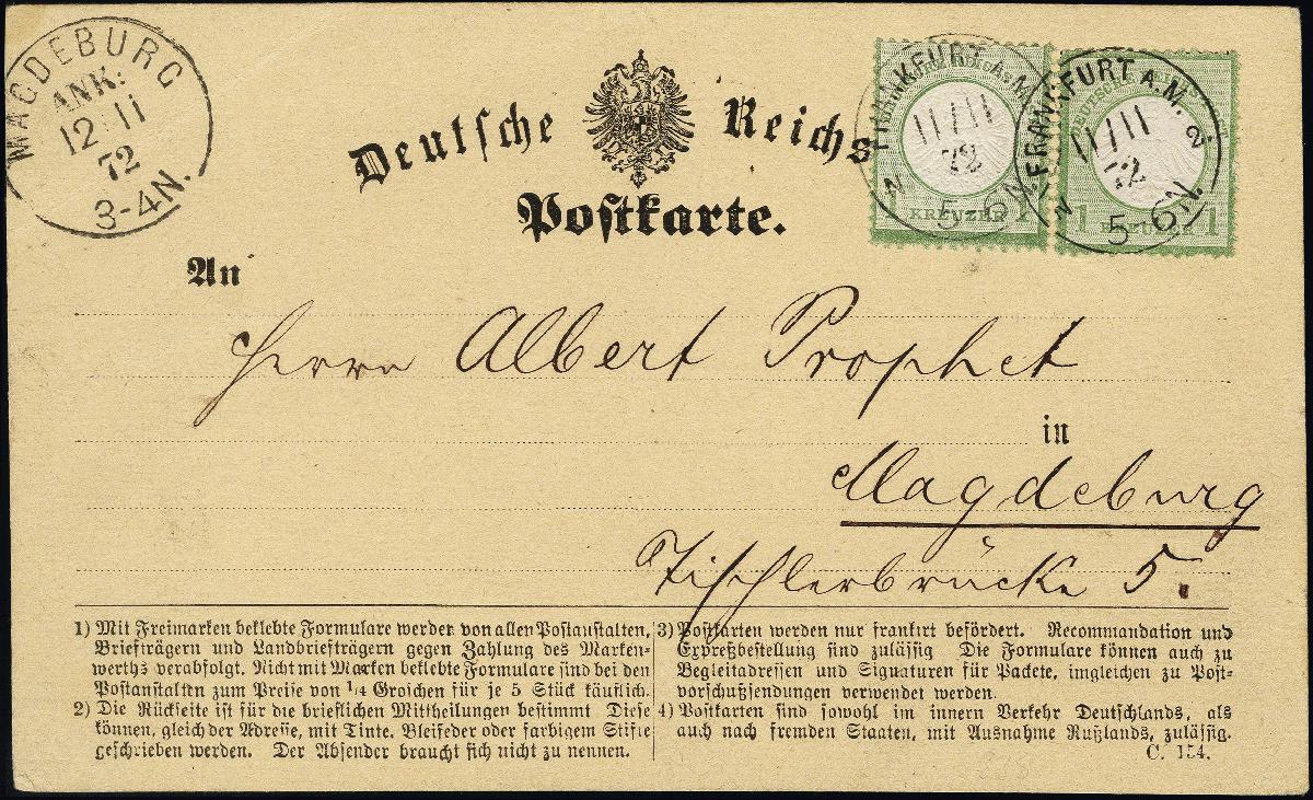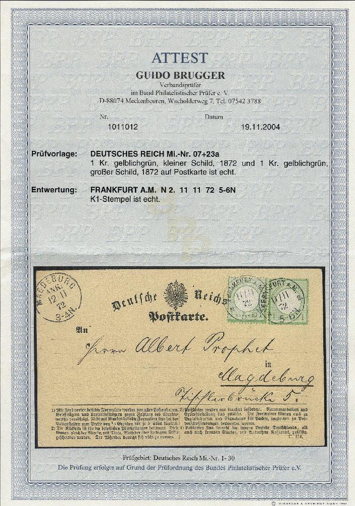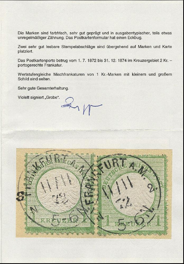 | Zusatzinformationen und Suchstichworte: | 376. Auktion Heinrich Köhler 19.-24. April 2021 Los 6073 1 Kreuzer gelblichgrün in Mischfrankatur mit Großer Schild 1 Kreuzer gelblichgrün je mit EKr. FRANKFURT A/M. 11.11.72“ als portogerechte Mehrfachfrankatur auf Postkarte nach Magdeburg mit vorderseitigem Ankunftsstempel, Marken mit teils etwas unregelmäßiger Zähnung und Postkartenformular mit Eckbug, sonst in guter Gesamterhaltung, dekorative und seltene wertstufengleiche Mischfrankatur, signiert Grobe und Fotoattest Brugger BPP (2004) Zuschlag 270,00 EUR |