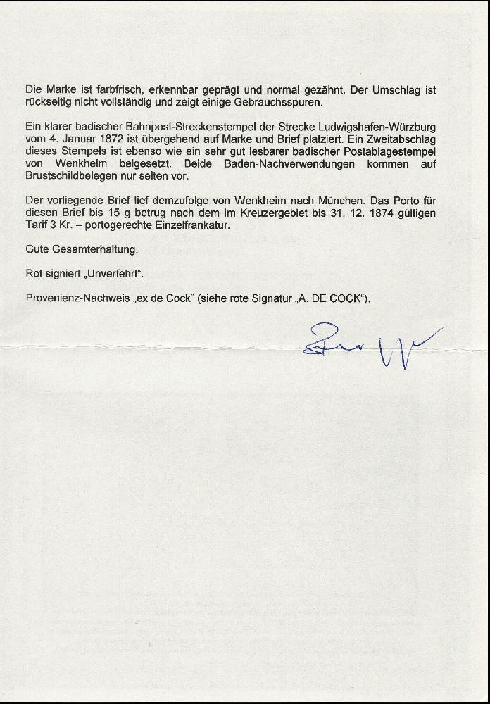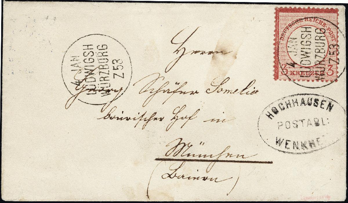 | Zusatzinformationen und Suchstichworte: | 376. Auktion Heinrich Köhler 19.-24. April 2021 Los 6077 3 Kreuzer karmin mit glasklarem auf- und nebengesetztem Bahnpost-EKr. „LUDWIGSH WÜRZBURG 4.JAN. Z53“ auf kleinformatigem Umschlag mit Ovalstempel „HOCHHAUSEN POSTABL: WENKEIM“ nach München mit Ankunftsstempel, rückseitig fehlt die Verschlussklappe und leichte Gebrauchsspuren, sonst in guter Gesamterhaltung; dekorative und seltene Entwertung, sign. Unverfehrt und Fotoattest Brugger BPP (2009) Zuschlag 540,00 EUR |