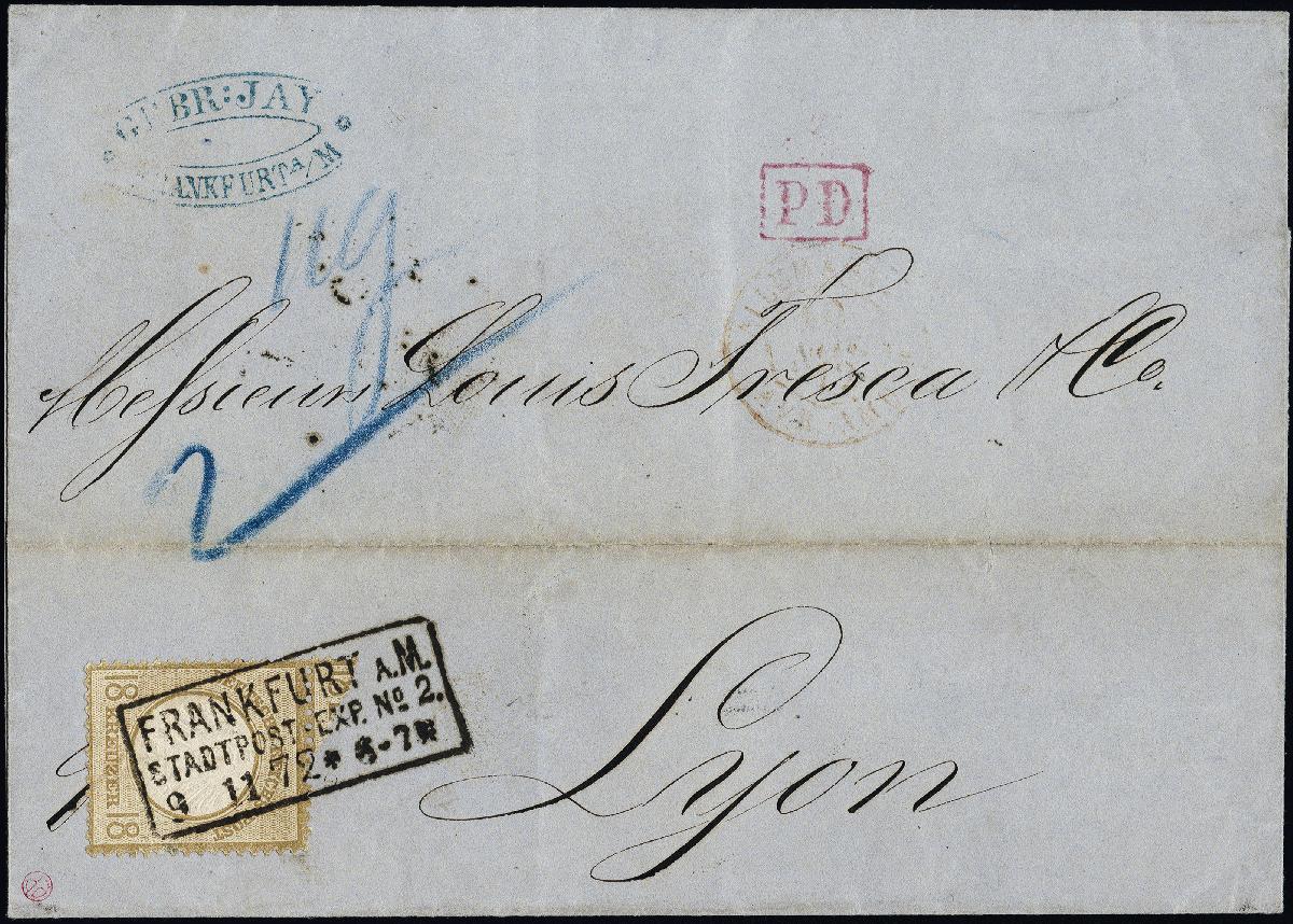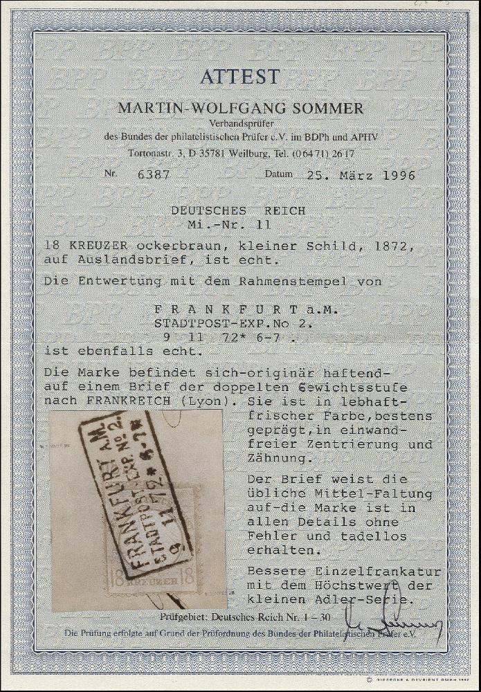 | Zusatzinformationen und Suchstichworte: | 376. Auktion Heinrich Köhler 19.-24. April 2021 Los 6086 18 Kreuzer ockerbraun mit Ra3 „FRANKFURTA.M. STADTPOST-EXP. No. 2 9.11.72“ als portogerechte Einzelfrankatur auf Faltbriefhülle der 2. Gewichtsstufe mit violettem Ra1 „PD“ nach Lyon mit Ankunftsstempel, Briefhülle mit üblicher waagerechter Faltung, sonst in einwandfreier Erhaltung, seltene Frankatur, Fotoattest Sommer BPP (1996) Zuschlag 1.000,00 EUR |
