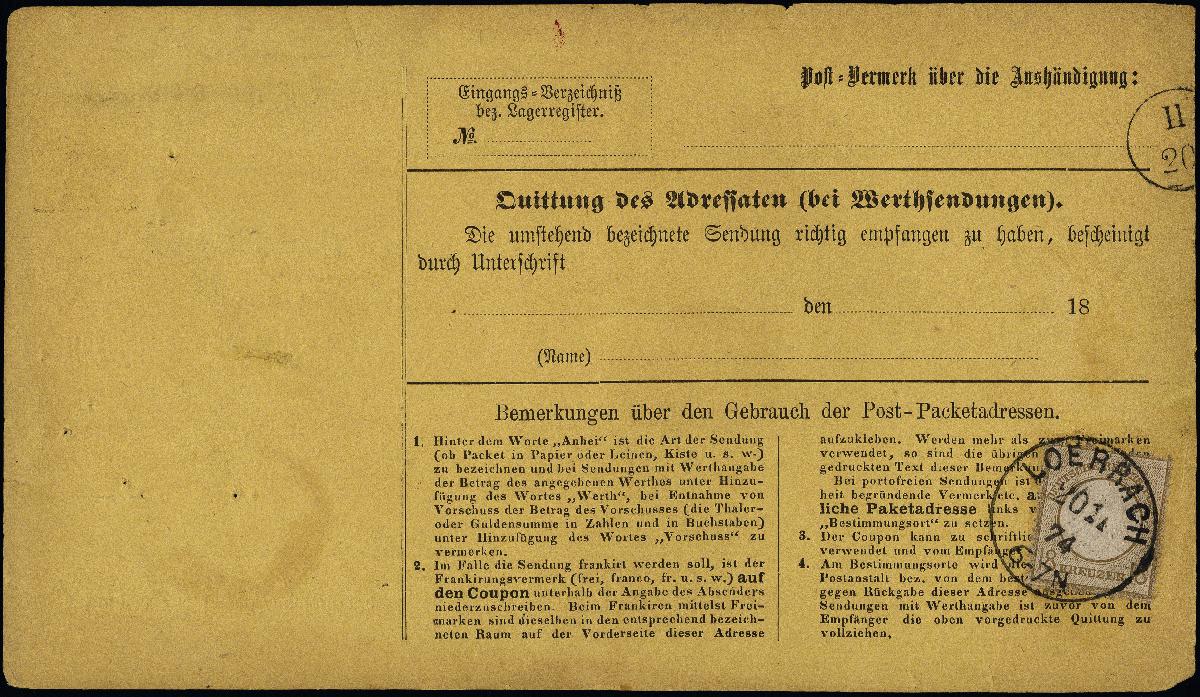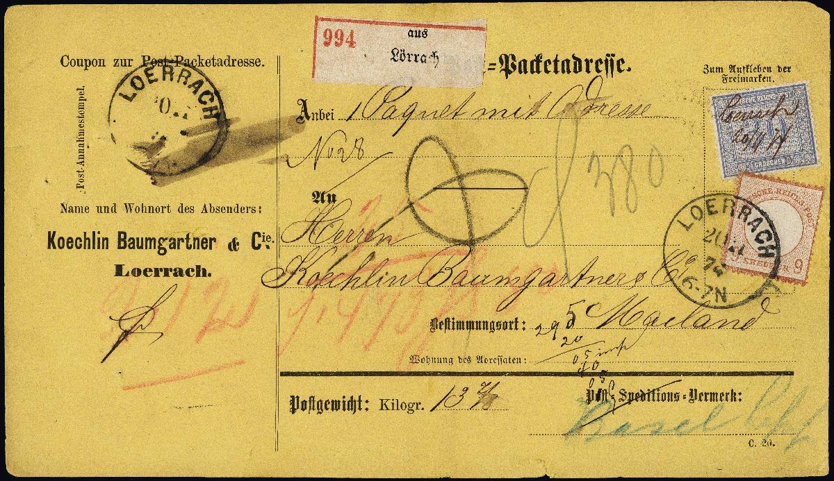 | Zusatzinformationen und Suchstichworte: | 376. Auktion Heinrich Köhler 19.-24. April 2021 Los 6087 18 Kreuzer ockerbraun in Mischfrankatur mit Großer Schild 9 Kreuzer braun, je mit EKr. LOERRACH 20.11.74“ vorder- und rückseitig auf kompletter Paketkarte mit Innendienst 30 Groschen blau mit handschriftlicher Entwertung nach Mailand, 9 Kreuzer eckrund und Formular mit kleinen Beförderungsspuren, sonst in guter Gesamterhaltung, sehr seltene Dreifarbenfrankatur in Verbindung mit der 30 Groschen-Marke aus dem Kreuzerbezirk, Fotoattest Sommer BPP (1994) Zuschlag 950,00 EUR |