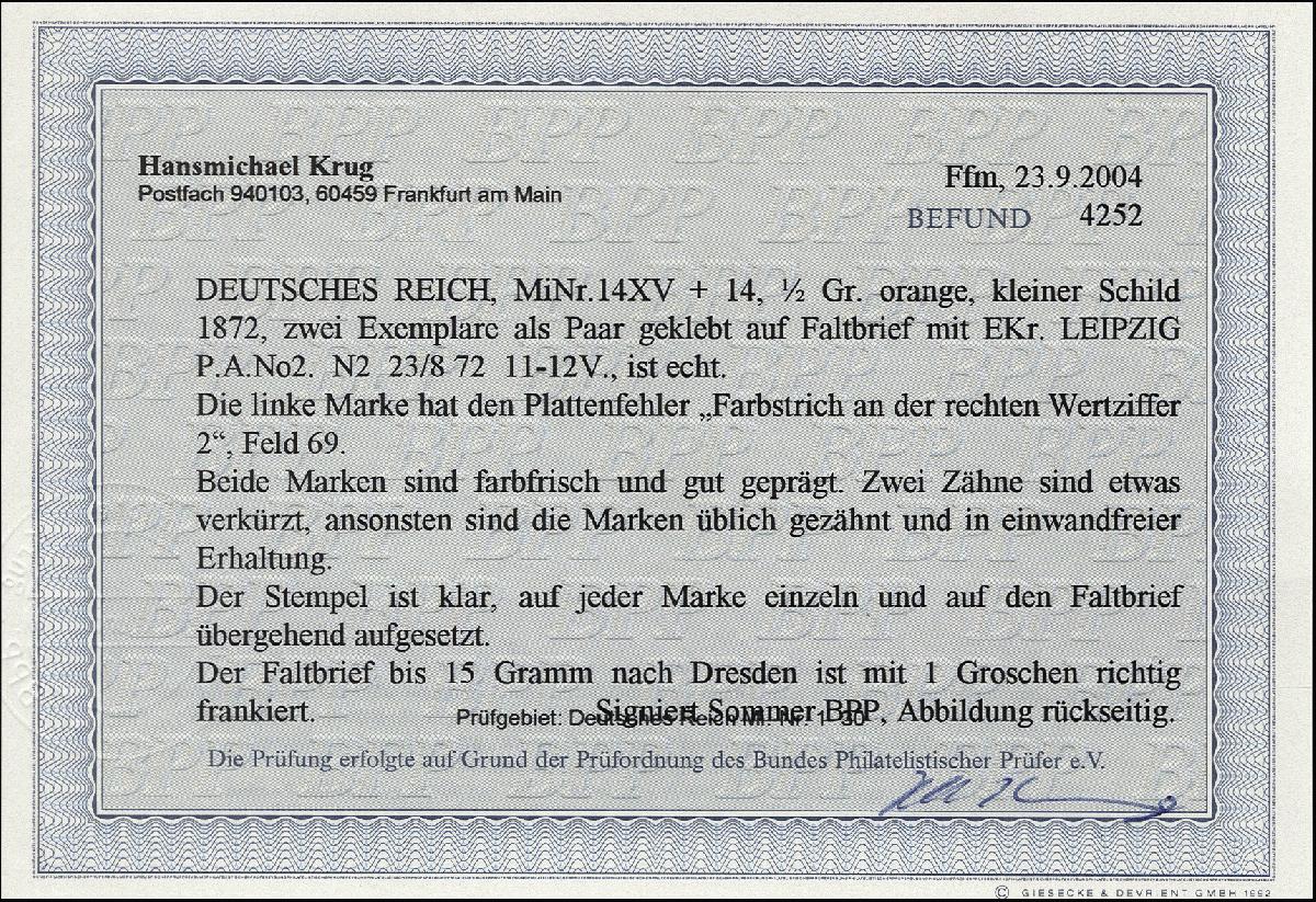 | Zusatzinformationen und Suchstichworte: | 376. Auktion Heinrich Köhler 19.-24. April 2021 Los 6095 ½ Groschen orange mit Plattenfehler „Farbstrich an der rechten Wertziffer 2“ (Feld 69) im waagerechten Paar mit Normalmarke mit EKr. „LEIPZIG P.A.No.2 N2 23.8.72“ als portogerechte Mehrfachfrankatur auf Faltbriefhülle nach Dresden mit Ausgabestempel, zwei verkürzte Zähne und Briefhülle links mit senkrechter Faltung, sonst in guter Gesamterhaltung, signiert Sommer BPP und Fotobefund Krug BPP (2004) Zuschlag 100,00 EUR |