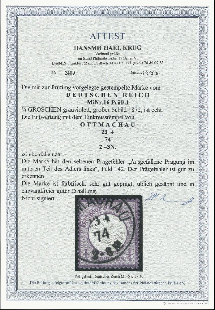 | Prüfgebiet: | Deutsches Reich 1871 - 1918 (Mi-Nr. 1 - 106) |
