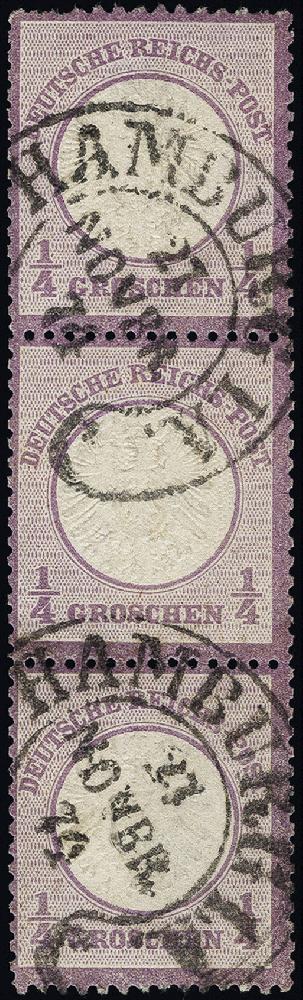 | Zusatzinformationen und Suchstichworte: | 376. Auktion Heinrich Köhler 19.-24. April 2021 Los 6103 ¼ Groschen graupurpur im senkrechten Dreierstreifen mit zwei klaren, fast kompletten Abschlägen des Hufeistempels „HAMBURG I.A. 27.NOVBR.74“ (Spalink 17-3M) ohne Zeitgruppenriegel, Einheit oben mit Zahnfehler und mit typischer senkrechter Druckspur und Scherenschnitt links und rechts, sonst in guter Gesamterhaltung; sehr seltener Stempel der Hamburger Lotteriebrief-Expedition, bisher sind nur wenige Exemplare mit diesem Stempel bekannt, Fotoattest Brugger BPP (2008) Zuschlag 480,00 EUR |