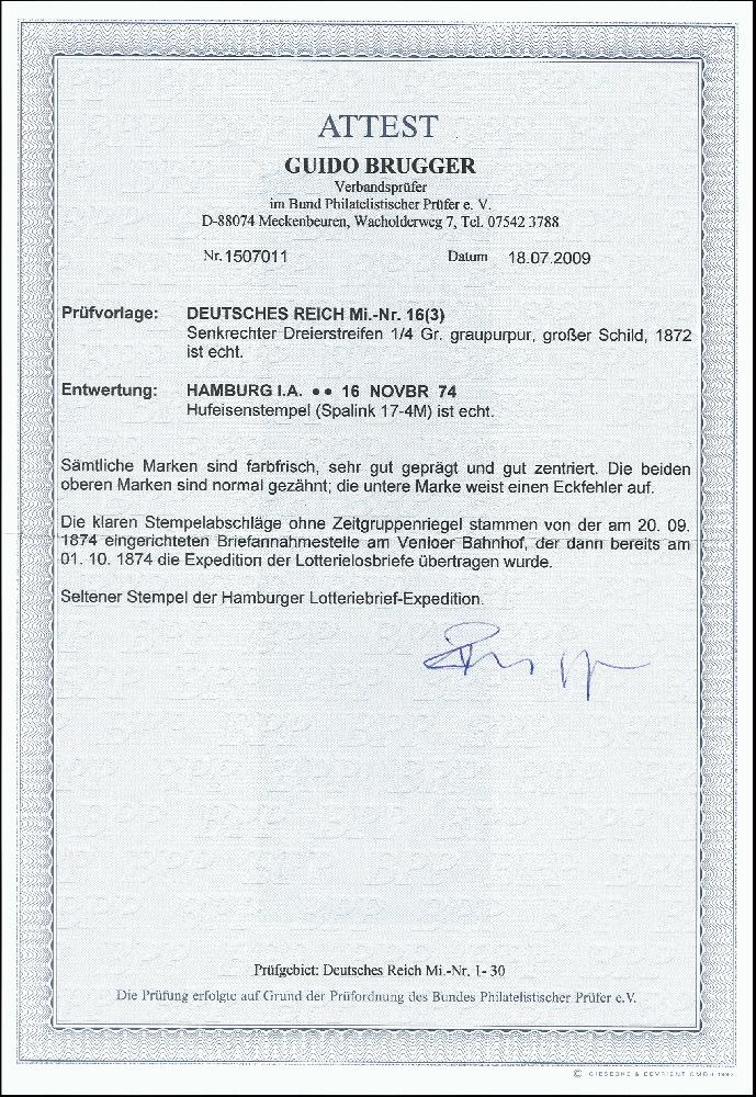 | Zusatzinformationen und Suchstichworte: | 376. Auktion Heinrich Köhler 19.-24. April 2021 Los 6104 ¼ Groschen graupurpur im senkrechten Dreierstreifen mit klaren Abschlägen des Hufeistempels „HAMBURG I.A. 16.NOVBR.74“ (Spalink 17-4M) ohne Zeitgruppenriegel, untere Marke mit Eckfehler, sonst in guter Gesamterhaltung, sehr seltener Stempel, Fotoattest Brugger BPP (2009) Ausruf 300,00 EUR |