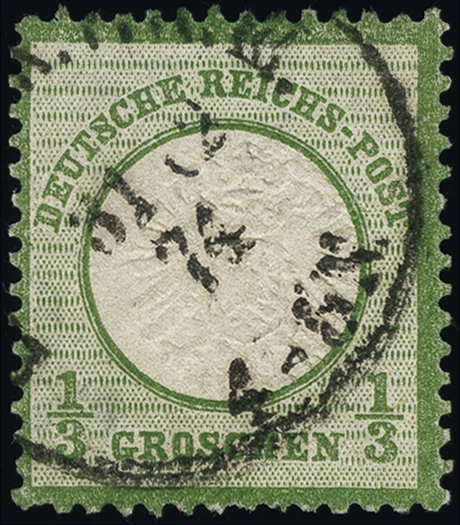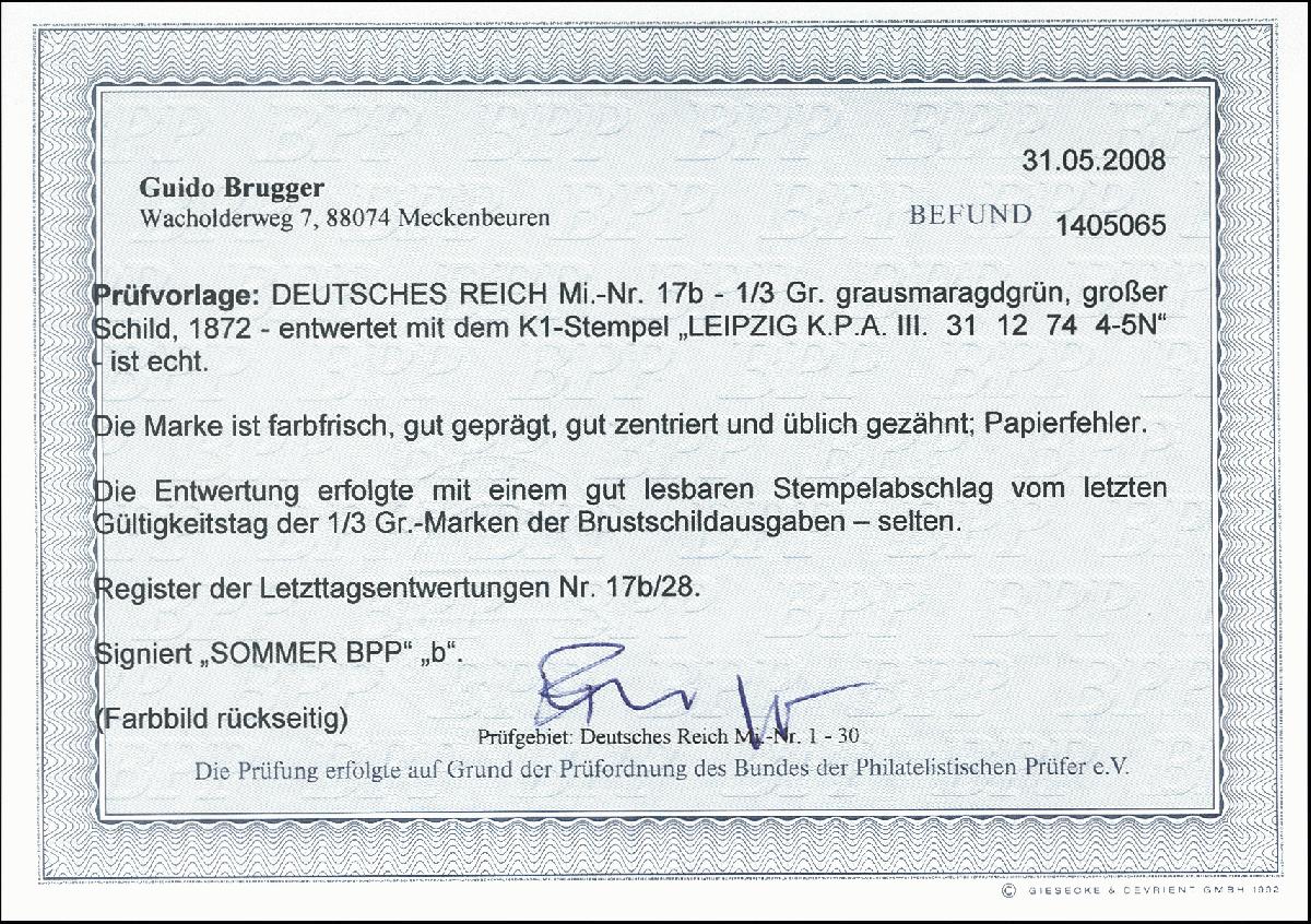 | Zusatzinformationen und Suchstichworte: | 376. Auktion Heinrich Köhler 19.-24. April 2021 Los 6115 1/3 Groschen grausmaragdgrün mit EKr. „LEIPZIG K.P.A. III 31.12.74“ vom letzten Gültigkeitstag der Marke, Papierfehler, bildseitig sonst einwandfreies Exemplar, signiert Sommer BPP und Fotobefund Brugger BPP (2008) Ausruf 100,00 EUR |