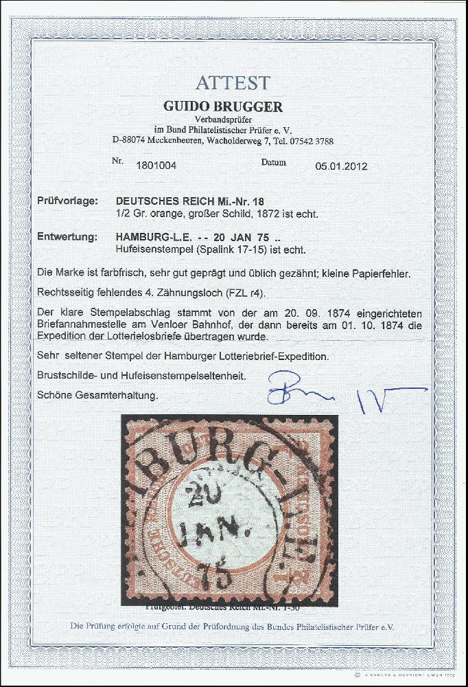 | Zusatzinformationen und Suchstichworte: | 376. Auktion Heinrich Köhler 19.-24. April 2021 Los 6119 ½ Groschen orange mit fehlendem Zähnungsloch 4 rechts und klarem Hufeistempel „HAMBURG – L.E. - - 20.JAN.75“ (Spalink 17-15), Marke mit kleinen Papierfehlern, sonst optisch in guter Gesamterhaltung, sehr seltener Stempel der Hamburger Lotteriebrief-Expedition, Fotoattest Brugger BPP (2012) Zuschlag 300,00 EUR |