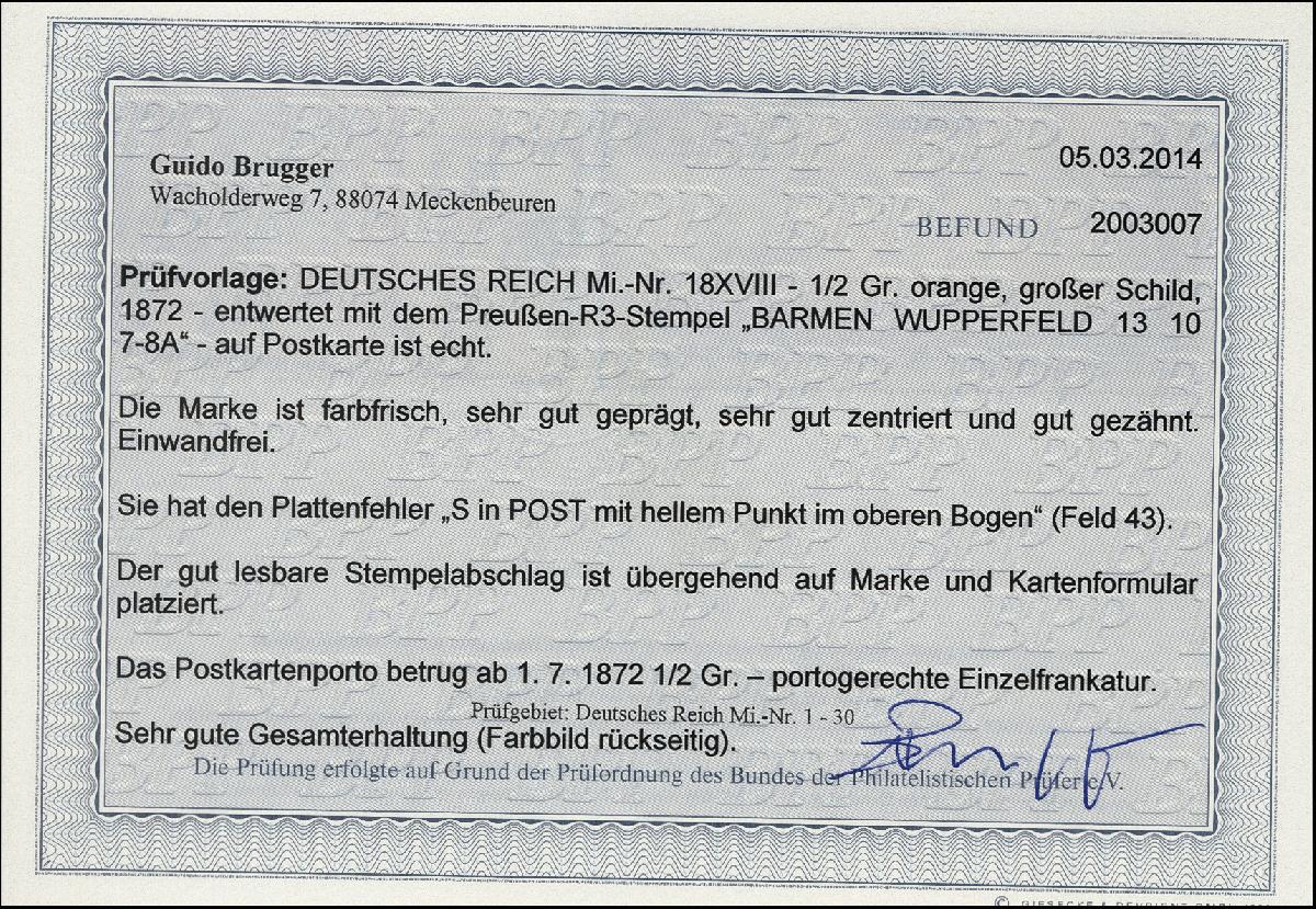 | Zusatzinformationen und Suchstichworte: | 376. Auktion Heinrich Köhler 19.-24. April 2021 Los 6128 ½ Groschen orange mit Plattenfehler „S in POST mit hellem Punkt im oberen Bogen“ (Feld 43) mit Ra3 „BARMEN WUPPERFELD 13.10.(73)“ als portogerechte Einzelfrankatur auf Postkarte nach Leipzig in einwandfreier, Fotobefund Brugger BPP (2014) Ausruf 80,00 EUR |