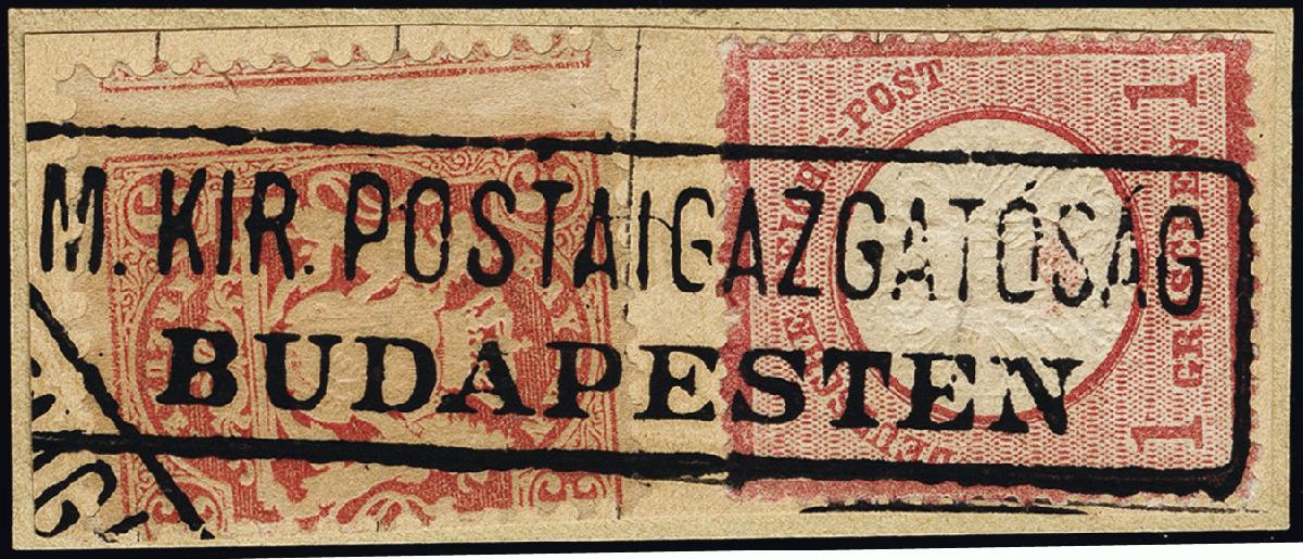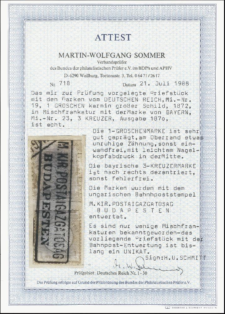 | Zusatzinformationen und Suchstichworte: | 376. Auktion Heinrich Köhler 19.-24. April 2021 Los 6143 1 Groschen karmin mit Schraubenkopfabdruck in Mischfrankatur mit Bayern Wappen 3 Kreuzer karmin gezähnt mit klarem ungarischem Bahnpost-Ra2 „M.KIR. POSTAIGAZGATOSAG BUDPASTEN“ auf Briefstück, bayrische Marke stark dezentriert und die 1 Groschen Marke oben mit unruhiger Zähnung, sonst in guter Gesamterhaltung, aus optischen Gründen auf Unterlage montiert; sehr ungewöhnliche Mischfrankatur mit Fremdentwertung, in dieser Form bisher einmaliges Stück, signiert J.U. Schmitt und Fotoattest Sommer BPP (1988) Zuschlag 290,00 EUR |