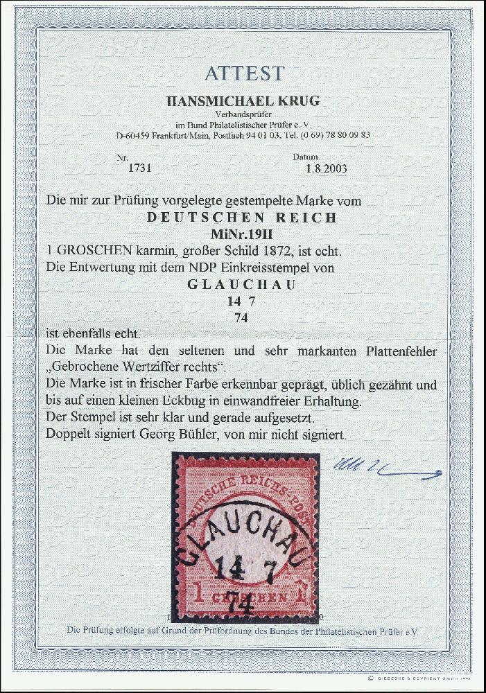 | Zusatzinformationen und Suchstichworte: | 376. Auktion Heinrich Köhler 19.-24. April 2021 Los 6145 1 Groschen karmin mit Plattenfehler „gebrochene rechte Wertziffer“, sauber mit klarem EKr. „GLAUCHAU 14.7.74“ entwertet, bis auf kleinem Eckbug in einwandfreier Erhaltung, Fotoattest Krug BPP (2003) Zuschlag 100,00 EUR |
