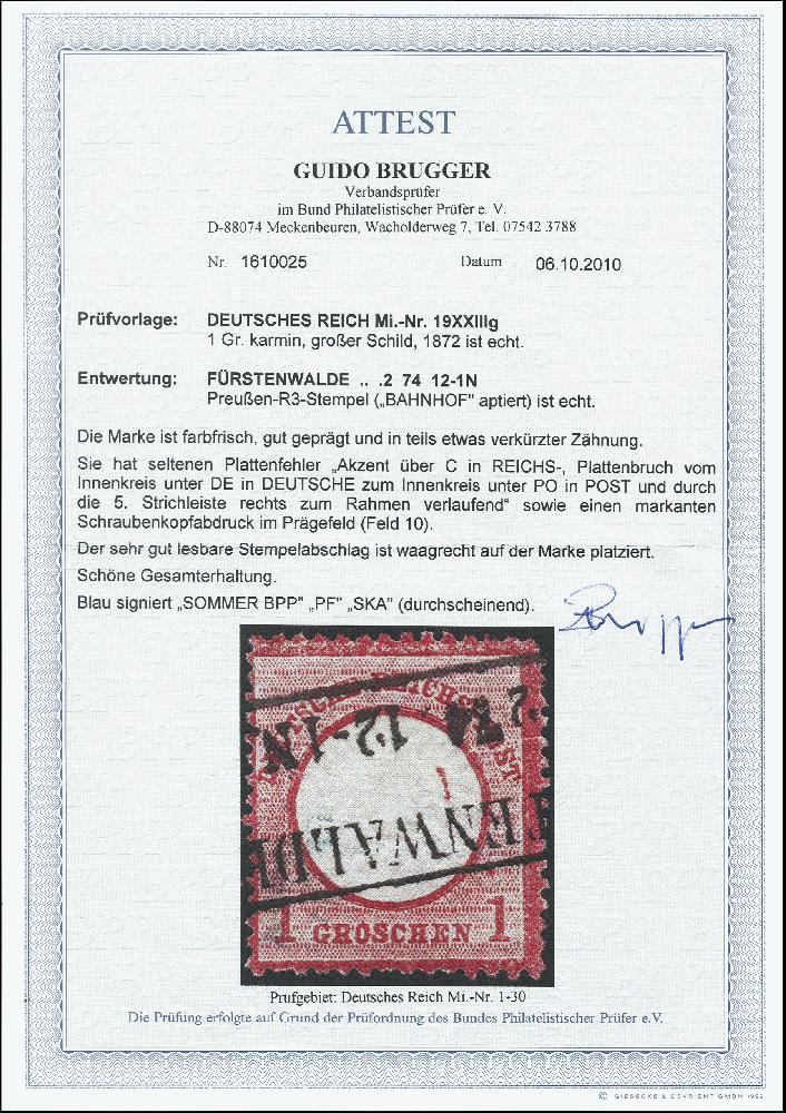 | Zusatzinformationen und Suchstichworte: | 376. Auktion Heinrich Köhler 19.-24. April 2021 Los 6151 1 Groschen karmin mit Plattenfehler „Akzent über C in REICHS, Plattenbruch vom Innenkreis unter DE in DEUTSCHE zum Innenkreis unter PO in Post und durch die 5. Strichleiste rechts zum Rahmen verlaufend“ (Feld 10) und mit markantem Schraubenkopfabdruck im Prägefeld, sauber mit Ra2 „FÜRSTENWALDE…2.74“ entwertet, zum Teil verkürzte Zähnung, sonst in guter Gesamterhaltung, signiert Sommer BPP und Fotoattest Brugger BPP (2010) Zuschlag 130,00 EUR |