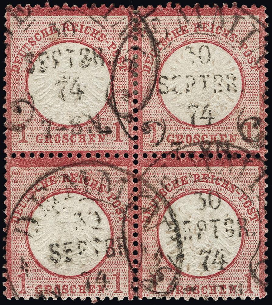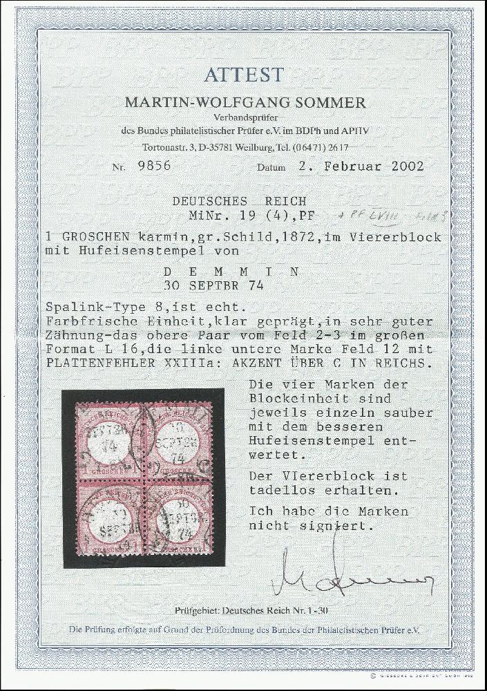 | Zusatzinformationen und Suchstichworte: | 376. Auktion Heinrich Köhler 19.-24. April 2021 Los 6159 1 Groschen karmin im Viererblock, linke untere Marke mit Plattenfehler „Akzent über C in REICHS auf der 1. Strichleiste“ (Feld 10) und die beiden oberen Marken im großen Format L16, sauber mit vier Abschlägen des Hufeisenstempels „DEMMIN 30.SEPTBR.74“ (Spalink 8) entwertet, dekorative Einheit in einwandfreier Erhaltung, Fotoattest Sommer BPP (2002) Zuschlag 110,00 EUR |