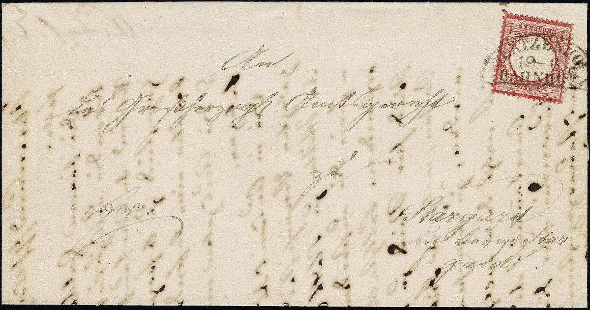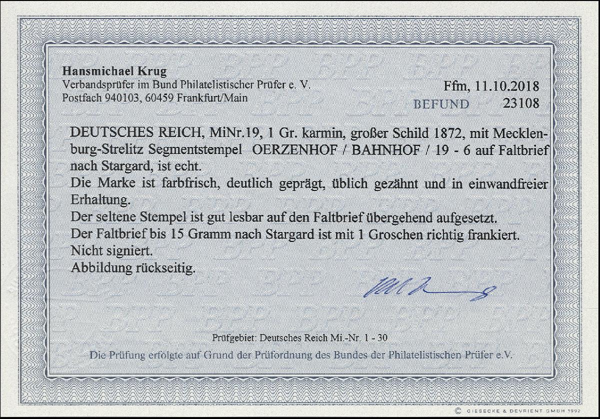 | Zusatzinformationen und Suchstichworte: | 376. Auktion Heinrich Köhler 19.-24. April 2021 Los 6165 1 Groschen karmin mit altem Mecklenburg-Strelitz Segmentstempel „OERZENHOF BAHNHOF 19.6.“ als portogerechte Einzelfrankatur auf komplettem Faltbrief nach Stargard mit Ausgabestempel in einwandfreier Erhaltung, Fotobefund Krug BPP (2018) Zuschlag 80,00 EUR |