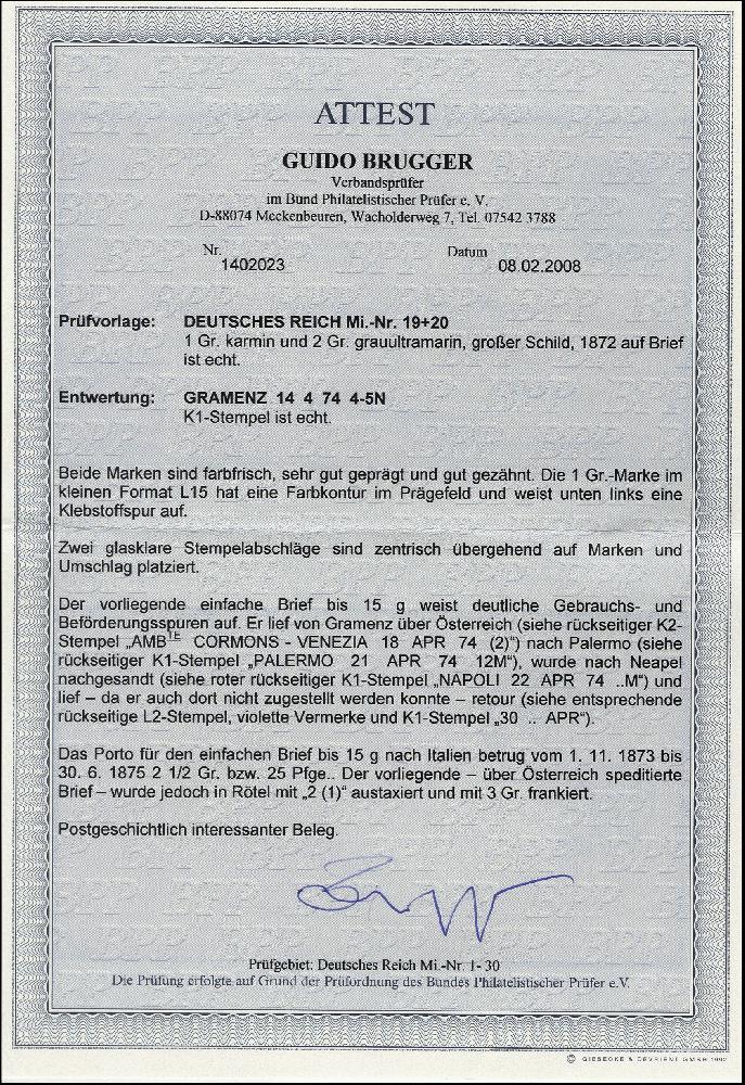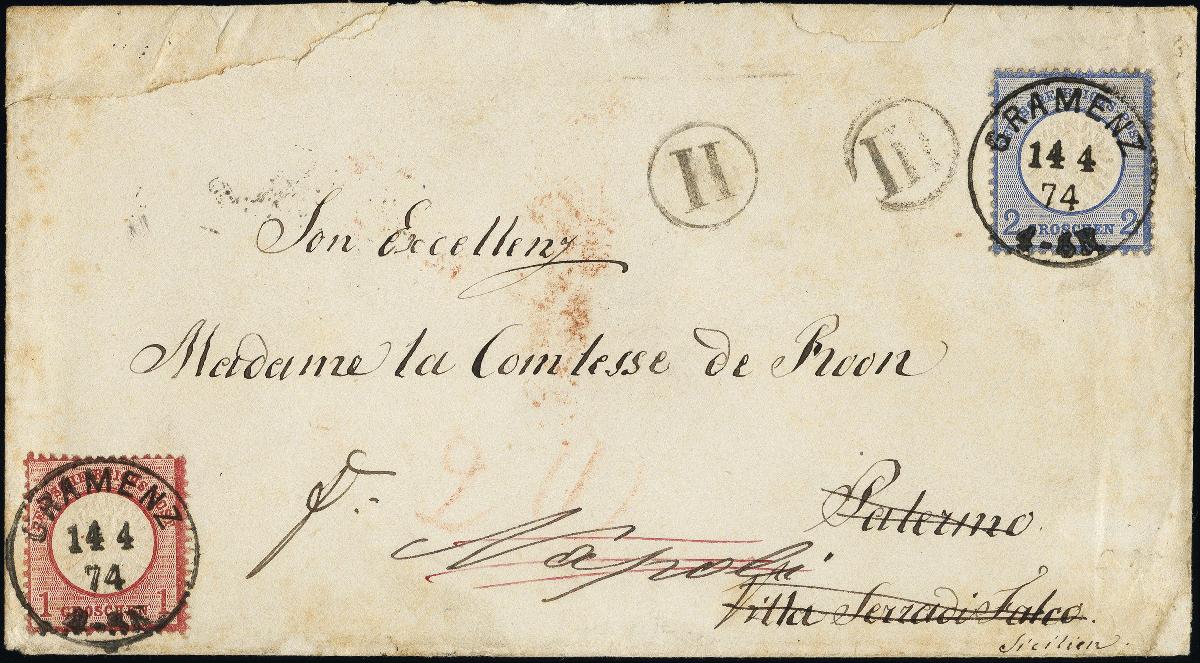 | Zusatzinformationen und Suchstichworte: | 376. Auktion Heinrich Köhler 19.-24. April 2021 Los 6194 1 Groschen karmin im kleinen Format L15 und 2 Groschen grauultramarin je mit klarem EKr. „GRAMENZ 14.4.74“ als Überfrankatur auf Brief mit Röteltaxe „2“ über Österreich nach Palermo mit rückseitigem DKr. „AMB TE CORMONS-VENEZIA 18.APR.74“ und Ankunftsstempel, anschließend Nachsendung nach Neapel ohne Zustellung und retour mit diversen Vermerken und Stempeln, Umschlag mit Öffnungsmängeln und Alterungsflecken, trotz der Einschränkungen ein postgeschichtlich interessanter Brief, Fotoattest Brugger BPP (2008) Ausruf 150,00 EUR |