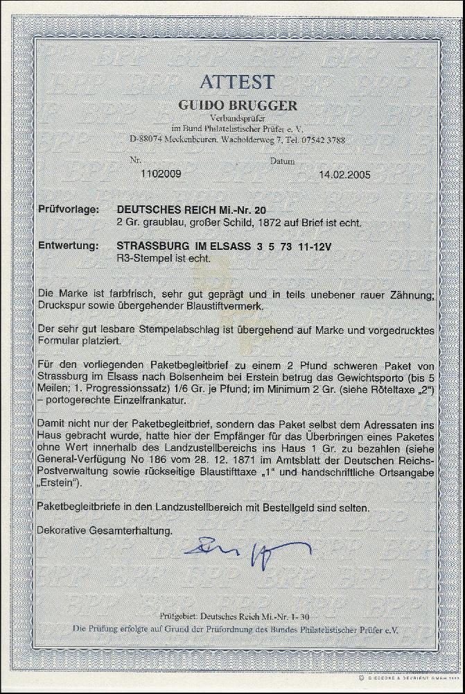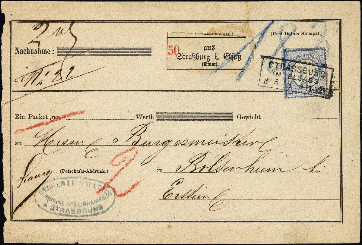 | Zusatzinformationen und Suchstichworte: | 376. Auktion Heinrich Köhler 19.-24. April 2021 Los 6204 2 Groschen graublau mit Ra3 „STRASSBURG IM ELASS 3.5.73“ als portogerechte Einzelfrankatur auf privat geducktem Paketbegleit-Halbbogen nach Bolsenstein bei Erstein mit Ankunftsstempel und rückseitiger Blaustifttaxe „1“ als Gebühr für das Überbringen eines Paketes ohne Wert innerhalb des Landzustellbereich ins Haus, Marke mit übergehendem Blaustiftvermerk und Formular mit leichten Falt- und Randspuren, seltene Verwendung, Fotoattest Brugger BPP (2005) Zuschlag 160,00 EUR |