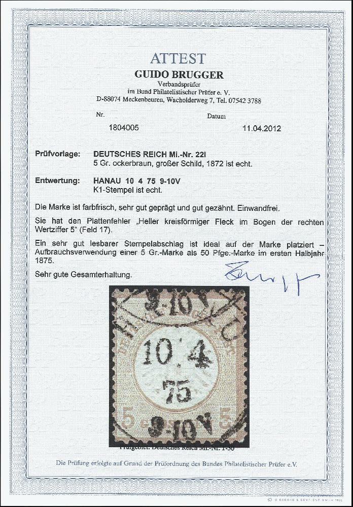 | Zusatzinformationen und Suchstichworte: | 376. Auktion Heinrich Köhler 19.-24. April 2021 Los 6224 5 Groschen ockerbraun mit Plattenfehler „heller kreisförmiger Fleck im Bogen der rechten Wertziffer 5“ (Feld 17), sauber mit EKr. „HANAU 10.4.75“ entwertet und in einwandfreier Erhaltung, als 50 Pfennig-Wert im ersten Halbjahr 1875 verwendet, Fotoattest Krug Brugger BPP (2012) Zuschlag 100,00 EUR |