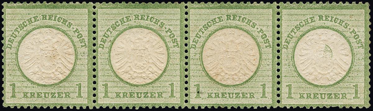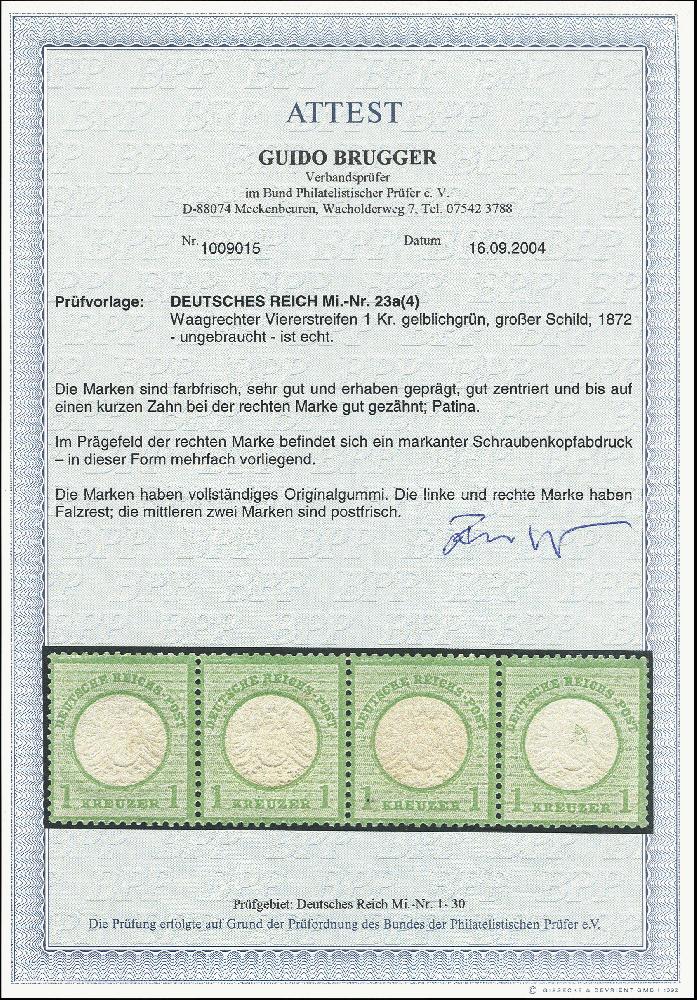 | Zusatzinformationen und Suchstichworte: | 376. Auktion Heinrich Köhler 19.-24. April 2021 Los 6230 1 Kreuzer gelblichgrün im waagerechten Viererstreifen, rechte Marke mit Schraubenkopfabdruck im Prägefeld, die beiden mittleren Marken postfrisch, die anderen Marken ungebraucht mit Falzrest, farbfrische Einheit in einwandfreier Erhaltung, unsigniert mit Fotoattest Brugger BPP (2004) Zuschlag 160,00 EUR |