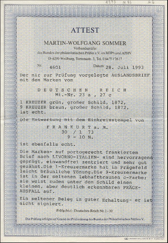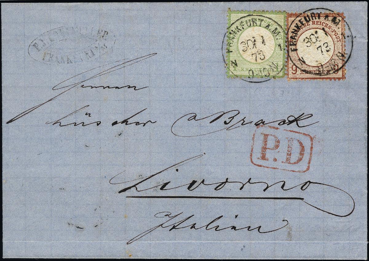 | Zusatzinformationen und Suchstichworte: | 376. Auktion Heinrich Köhler 19.-24. April 2021 Los 6236 1 Kreuzer gelblichgrün und 9 Kreuzer braun mit kleinem Prägeausfall unter dem Schild, je mit klarem EKr. „FRANKFURT A.M. N1 30.1.73“ als portogerechte Frankatur auf komplettem Faltbrief mit rotem „Ra1 P.D“ nach Livorno, Italien mit Ankunftsstempel, beide Marken mit leichter Tönung im Prägefeld, sonst in guter Gesamterhaltung, dekorative Buntfrankatur mit seltener Farbnuance, Fotoattest Sommer BPP (1993) Ausruf 600,00 EUR |