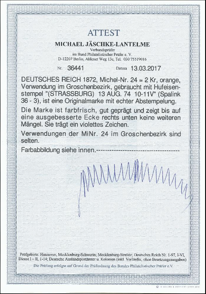 | Zusatzinformationen und Suchstichworte: | 376. Auktion Heinrich Köhler 19.-24. April 2021 Los 6243 2 Kreuzer orange mit Hufeisenstempel „(STRASSBURG) i. ELS. 13.AUG.74“ (Spalink 36-3), untere rechte Ecke repariert, sonst in einwandfreier Erhaltung, farbfrisches und optisch ansprechendes Exemplar mit sehr seltener Verwendung im Groschenbezirk, Hufeisenstempel auf dieser Marke sind extrem selten. Fotoattest Jäschke-L. BPP (2017) Zuschlag 480,00 EUR |