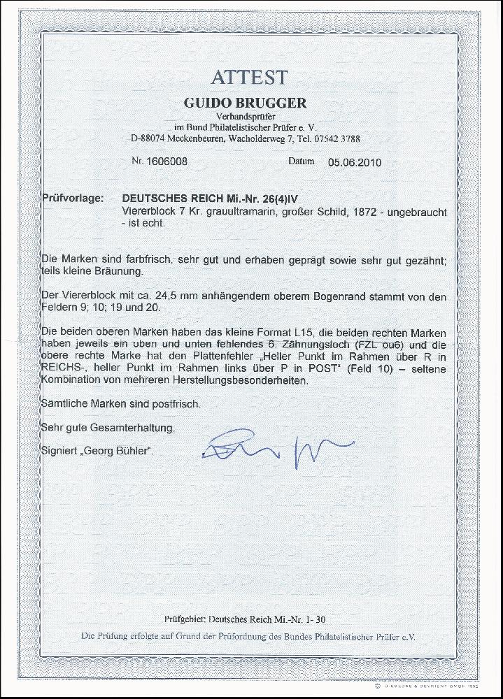 | Zusatzinformationen und Suchstichworte: | 376. Auktion Heinrich Köhler 19.-24. April 2021 Los 6259 7 Kreuzer grauultramarin im Viererblock mit breitem Oberrand, beide oberen Marken im kleinen Format L15 und die beiden rechten Marken je mit fehlendem Zähnungsloch 6 oben und unten, die rechte obere Marke hat zusätzlich den Plattenfehler „helle Punkte im Rahmen über R in REICHS und P in POST“ (Feld 10), postfrisch mit drei kleinen Gelbflecken, sonst in guter Erhaltung, signiert Bühler und Fotoattest Brugger BPP (2010) Zuschlag 1.350,00 EUR |