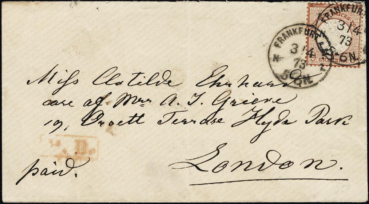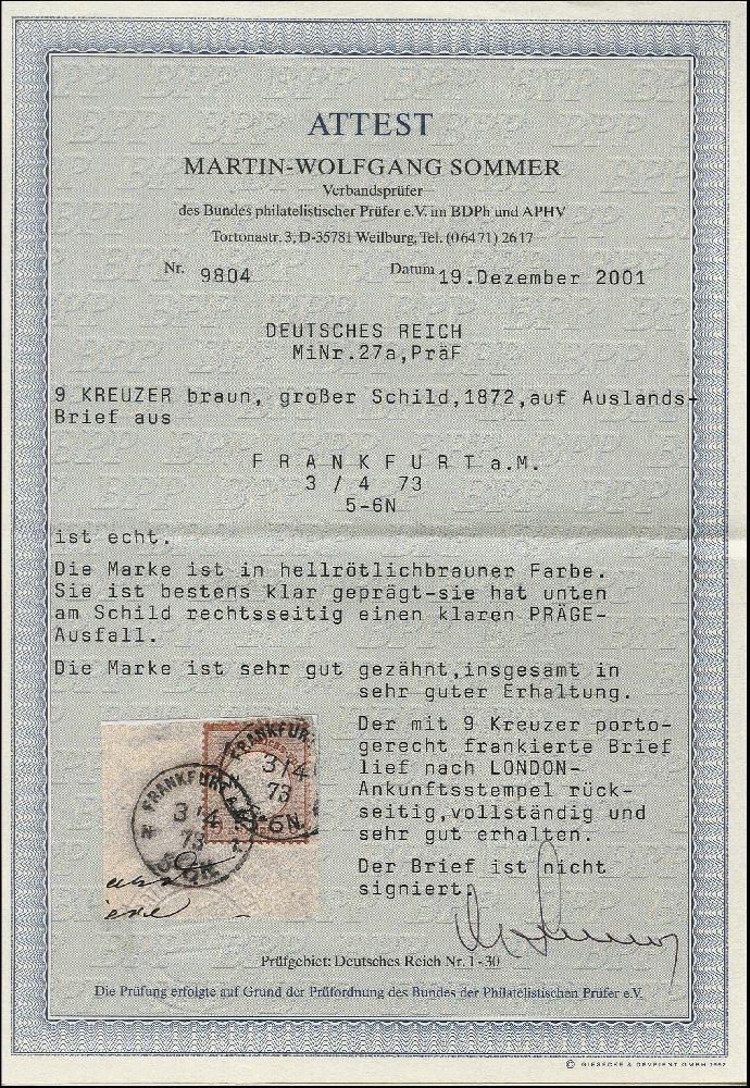 | Zusatzinformationen und Suchstichworte: | 376. Auktion Heinrich Köhler 19.-24. April 2021 Los 6266 9 Kreuzer hellrötlichbraun mit Prägefehler unten rechts am Schild, mit klarem EKr. „FRANKFURT N1 3.4.73“ als portogerechte Einzelfrankatur auf Brief mit rotem Ra1 „P.D.“ nach London mit Ankunftsstempel, Umschlag einmal gefaltet, sonst in guter Gesamterhaltung, Fotoattest Sommer BPP (2001) Zuschlag 250,00 EUR |