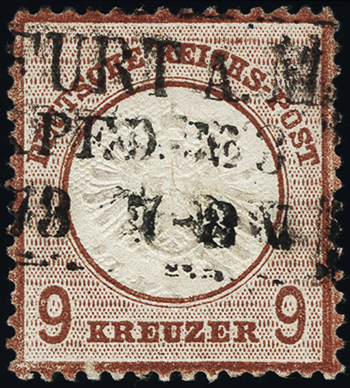 | Zusatzinformationen und Suchstichworte: | 376. Auktion Heinrich Köhler 19.-24. April 2021 Los 6269 9 Kreuzer dunkelbraun mit Prägefehler „diagonal ausgefallene Prägung im unteren Teil des Adlers links“ (Feld 142, Type I), sauber mit Ra3 „FRANKFURT A.M. STADT-POST-EXPED. No 3…73“ entwertet, kleine Farbabsplitterung bei einem Zahn unten, sonst in einwandfreier Erhaltung, sehr selten, Fotoattest Brugger BPP (2000) Ausruf 500,00 EUR |