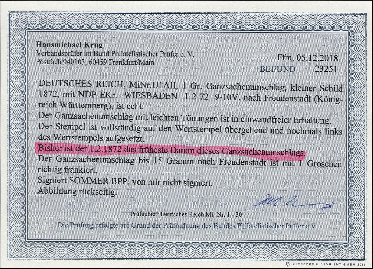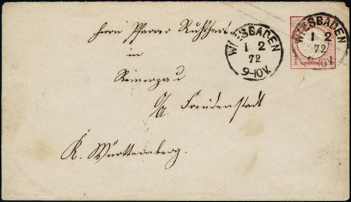 | Zusatzinformationen und Suchstichworte: | 376. Auktion Heinrich Köhler 19.-24. April 2021 Los 6303 Ganzsachenumschlag 1 Groschen mit Wertstempeltype II, mit EKr. „WIESBADEN 2.1.72“ nach Freudenstadt mit Ankunftsstempel, etwas fleckig und Patina, sonst in guter Gesamterhaltung, bisher das früheste Datum dieses Ganzsachenumschlags, Fotobefund Krug BPP (2018) Ausruf 100,00 EUR |