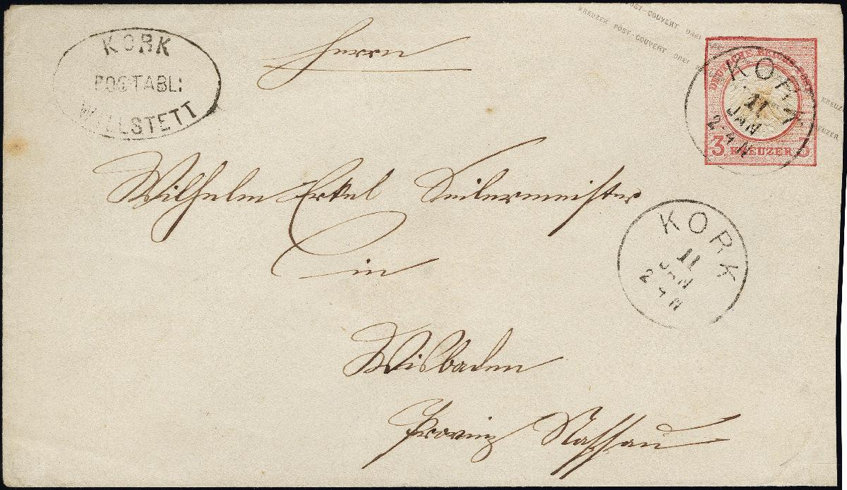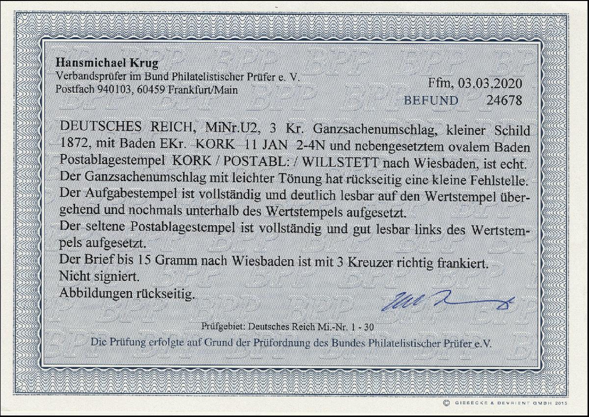 | Zusatzinformationen und Suchstichworte: | 376. Auktion Heinrich Köhler 19.-24. April 2021 Los 6310 Ganzsachenumschlag 3 Kreuzer mit EKr. „KORK 11.JAN.“ und nebengesetztem ovalen Postablagestempel „KORK POSTABL: WILLSTETT“ nach Wiesbaden mit Ausgabestempel, Umschlag mit leichter Tönung im Wertstempel und rückseitig mit kleiner Fehlstelle, sonst in guter Gesamterhaltung, Fotobefund Krug BPP (2020) Zuschlag 80,00 EUR |