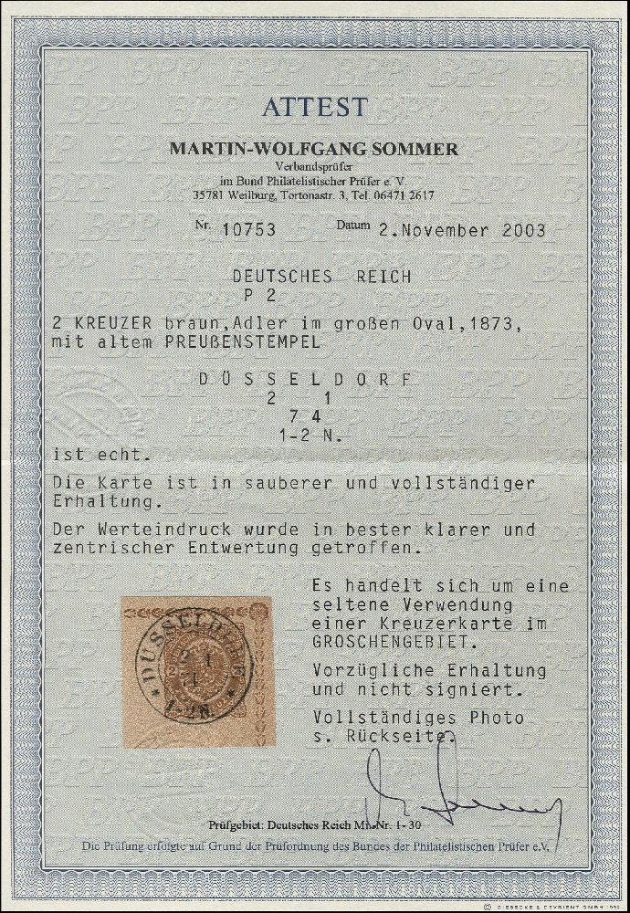 | Zusatzinformationen und Suchstichworte: | 376. Auktion Heinrich Köhler 19.-24. April 2021 Los 6327 Ganzsachenkarte 2 Kreuzer mit klarem DKr. „DÜSSELDORF 2.1.74“ nach Elberfeld in einwandfreier Erhaltung, seltene Verwendung im Groschengebiet, Fotoattest Sommer BPP (2003) Zuschlag 90,00 EUR |