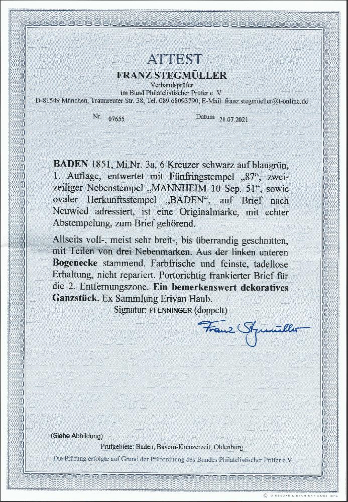 | Zusatzinformationen und Suchstichworte: | 377. Auktion Heinrich Köhler 20. - 25. September 2021 Los 1 6 Kreuzer schwarz auf blaugrün, linkes Randstück, unten voll- bis breitrandig, sonst überrandig mit Teilen von 3 Nachbarmarken und schmalem Bogenrand links, aus der linken unteren Bogenecke stammend, mit leicht und sauber aufgesetzter Nummer "87" und nebengesetztem Langstempel "MANNHEIM 10 Sep. 51" sowie Ovalstempel "BADEN" auf komplettem Faltbrief nach Neuwied. Sehr schöne und tadellose Erhaltung. Ein Ausnahmestück. Signiert Pfenninger und Fotoattest Stegmüller BPP (2021) Ausruf 300,00 EUR Zuschlag 500,00 EUR (aus der Sammlung Erivan Haub) |