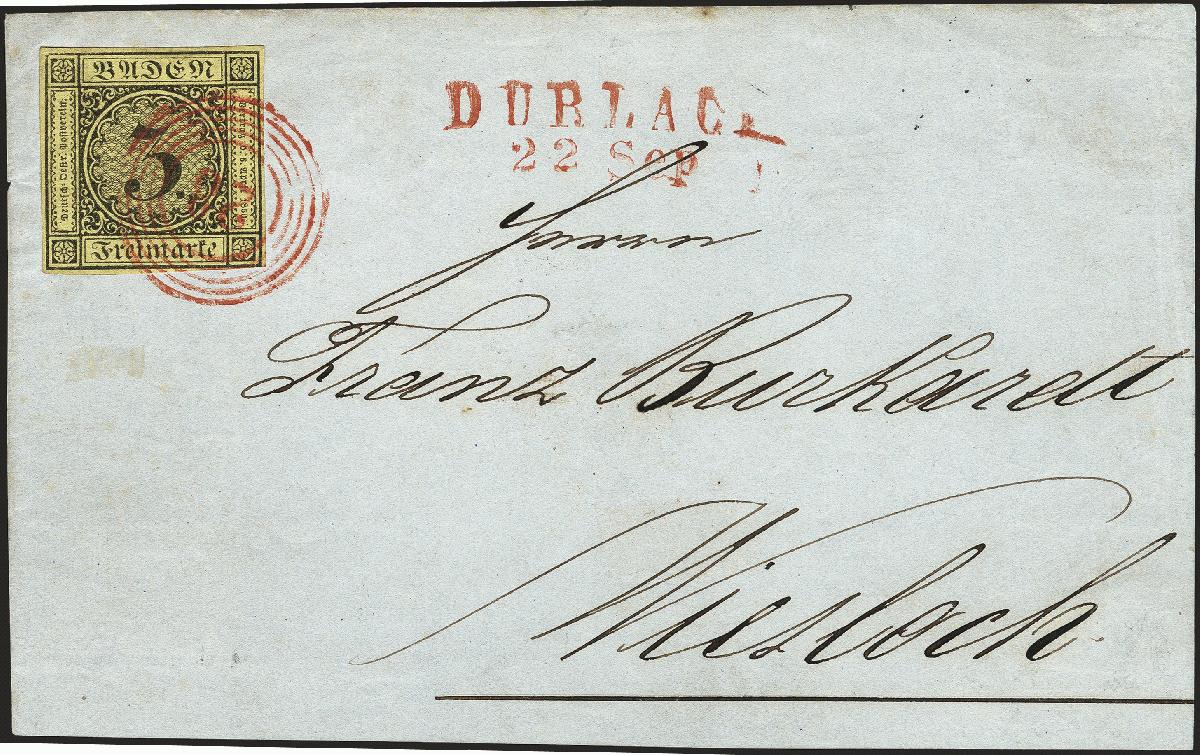 | Zusatzinformationen und Suchstichworte: | 377. Auktion Heinrich Köhler 20. - 25. September 2021 Los 5 3 Kreuzer schwarz auf gelb, unten rechts winzig berührt, sonst voll- bis breitrandig und farbfrisch mit sauber aufgesetzter roter Nummer "87" und nebengesetztem roten Langstempel "DURLACH 22 Sep." auf Briefvorderseite nach Wiesloch, tadellos. Kurzbefund Stegmüller BPP Ausruf 80,00 EUR Zuschlag 280,00 EUR (aus der Sammlung Erivan Haub) |